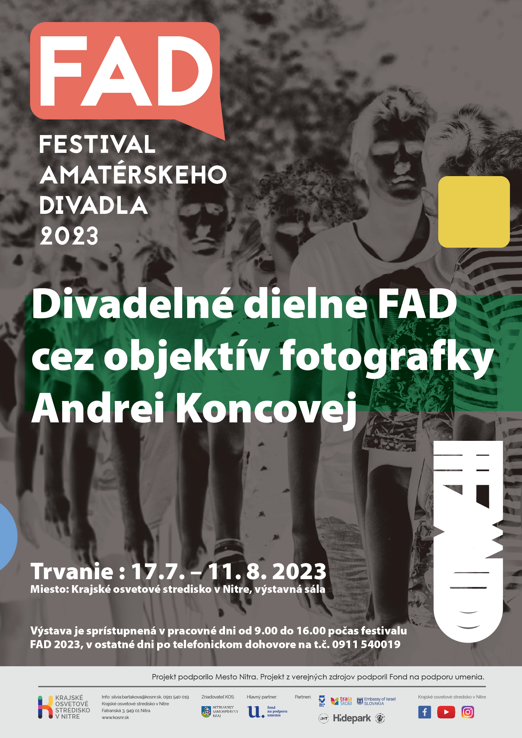 Názov : Divadelné dielne FAD cez objektív Fotografky Andrei Koncovej Dátum : 17.7.- 11.8. 2023 Miesto: Krajské osvetové stredisko v Nitre, výstavná sála
