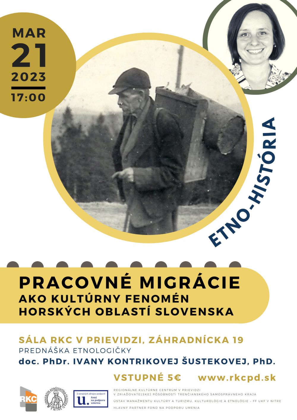 Prednáška etnologičky doc. PhDr. Ivany Kontrikovej Šustekovej, PhD. V prvej polovici 20. storočia na Slovensku dominovali migrácie za prácou. Ako sociálne procesy boli vo väčšine prípadov odpoveďou na ekonomické, ekologické, sociálne, ideologické a kultúrne podmienky materskej oblasti. Cieľom prednášky je na konkrétnych príkladoch predstaviť pracovné migrácie na Slovensku do polovice 20. storočia ako kultúrny fenomén horských oblastí.
