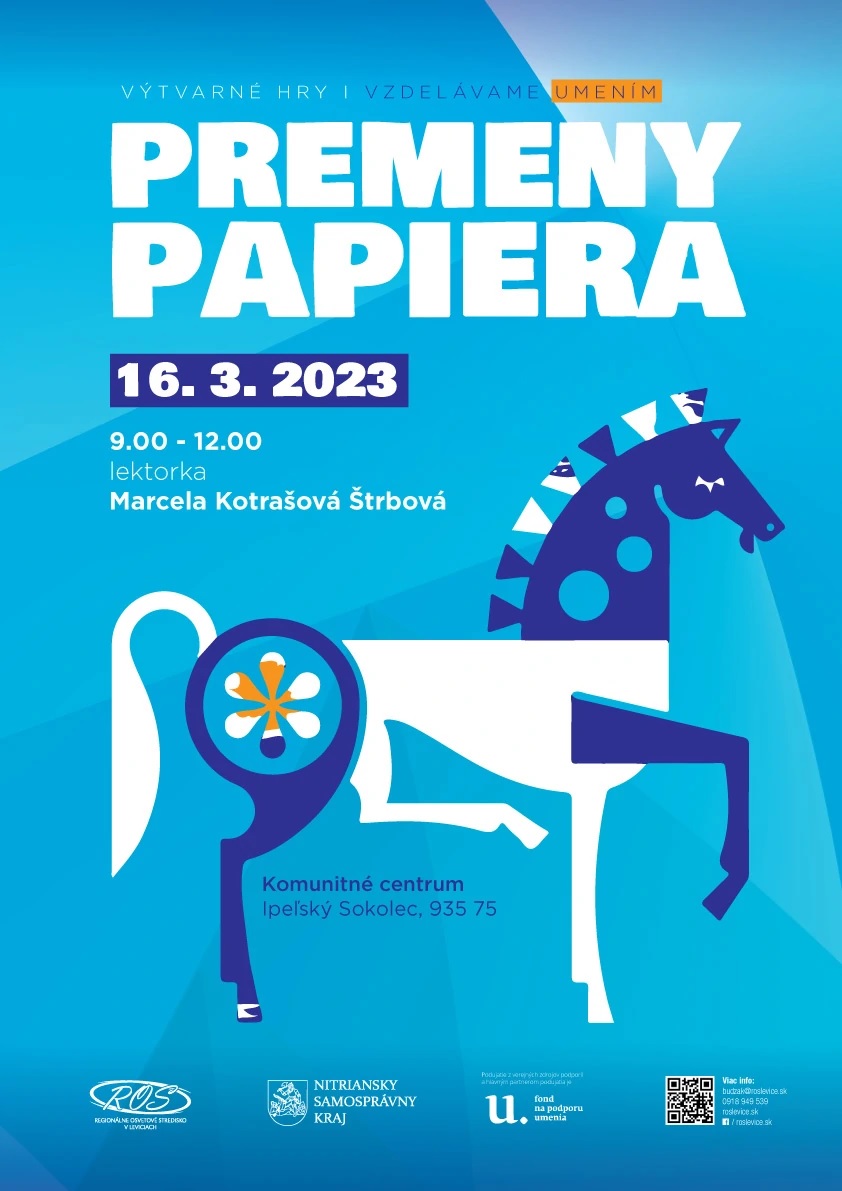 V rámci projektu Vzdelávame umením (výtvarné a remeselné workshopy) prinášame workshopy Výtvarné hry do rôznych komunitných centier nášho okresu. Prvý bude v Ipeľskom Sokolci s názvom Premeny papiera s lektorkou Marcelou Kotrášovou Štrbovou.