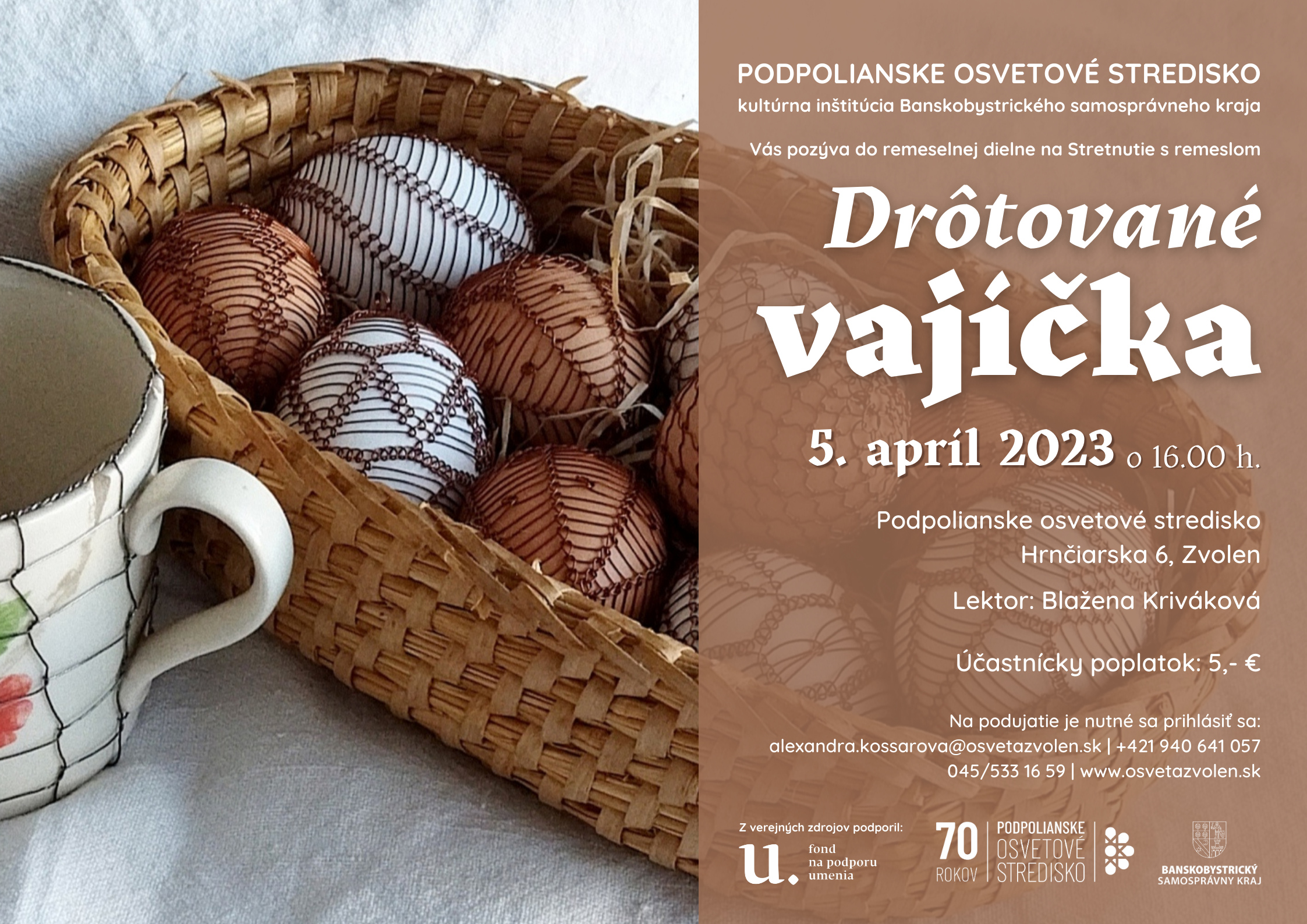 V programe Stretnutie s remeslom dávame príležitosť nahliadnuť do tajov remesla pod dohľadom skúsených majstrov. Tentoraz si vyskúšame zdobiť vajíčko drôtom s lektorkou Blaženou Krivákovou.