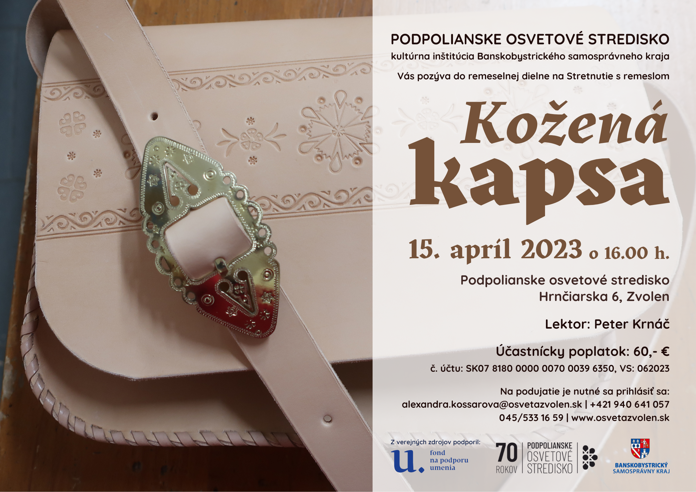 Stretnutie s remeslom je príležitosť vyskúšať si remeselnú techniku pod dohľadom skúseného majstra. Tentokrát si vyrobíme koženú kapsu s Petrom Krnáčom.