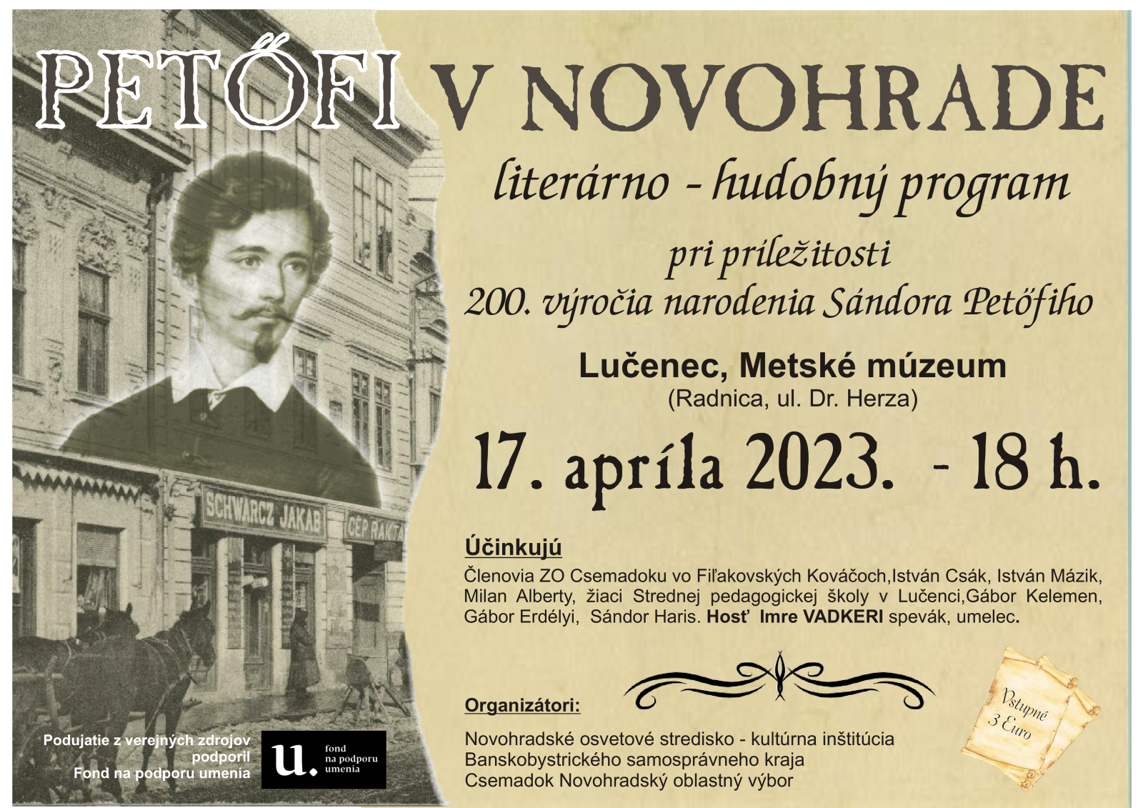 Zámerom je zrealizovať literárno-hudobný program pri príležitosti 200. výročia narodenia maďarského básnika slovenského pôvodu Sándora Petőfiho, ktorého tvorba a život je spojený s Novohradom, a priamo s mestom Lučenec , kde v roku 1845 žil aj tvoril.