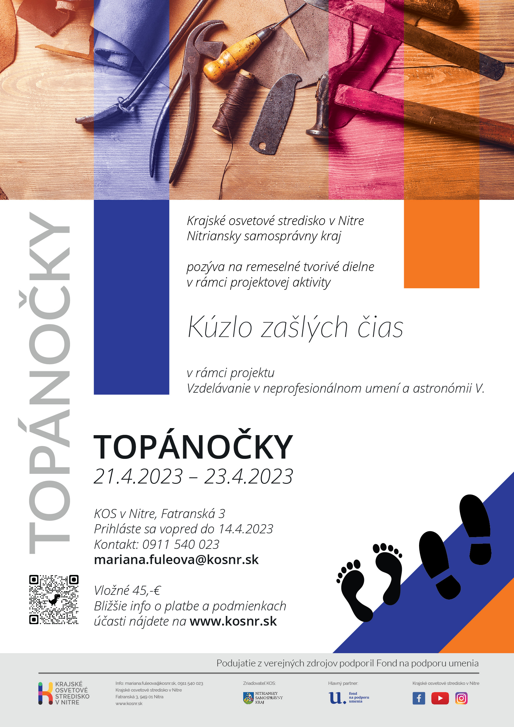 Trojdňová remeselná tvorivá dielňa zameraná na obuvníctvo. Venovať sa budeme ručne šitej bosonohej obuvi. Kde: Krajské osvetové stredisko v Nitre Lektorka: Zuzana Ágová