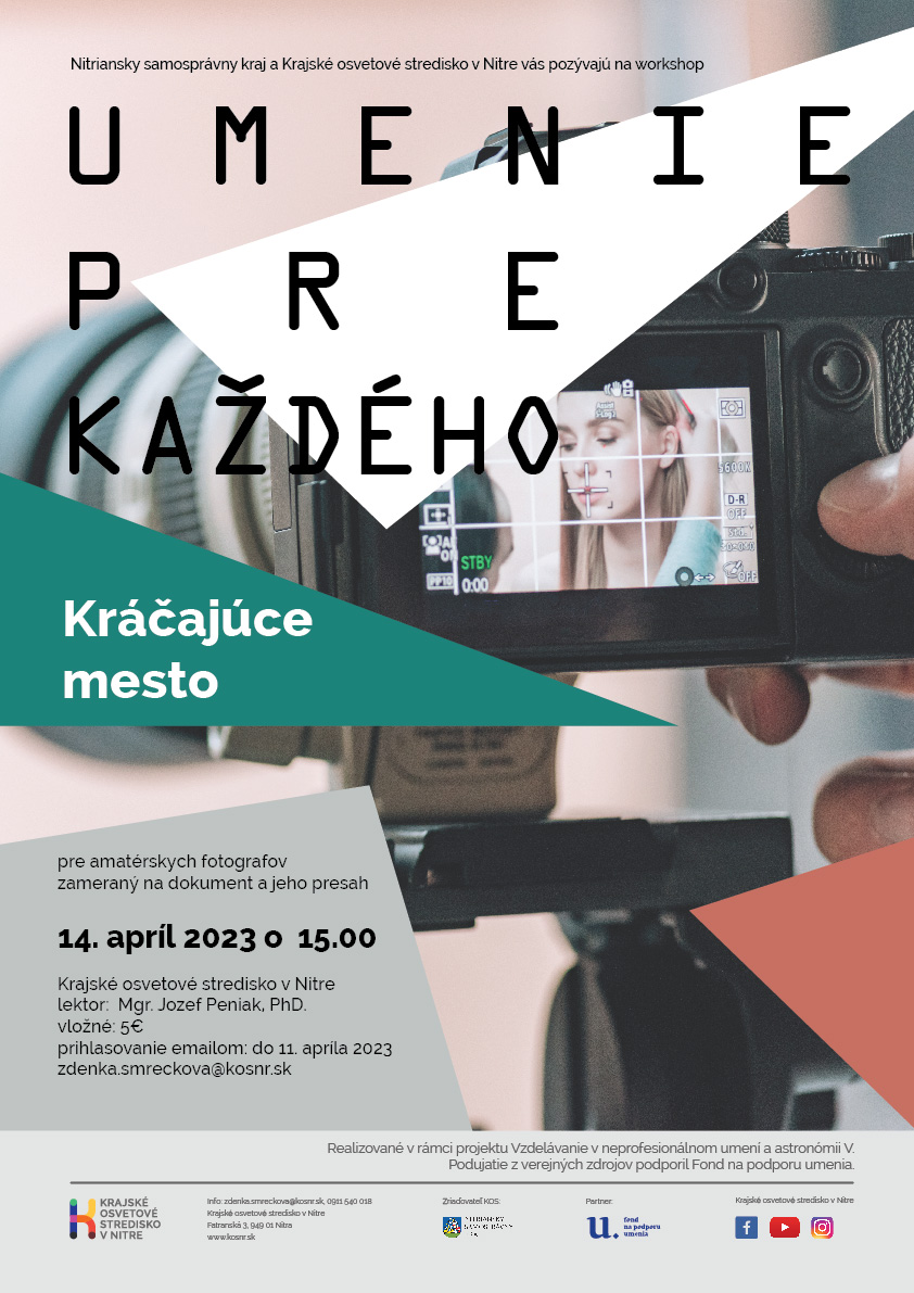 fotografický workshop amatérskych fotografov zameraný na dokumentárnu fotografiu a jej presah kde: Nitra lektor: Mgr. Jozef Peniak, PhD.