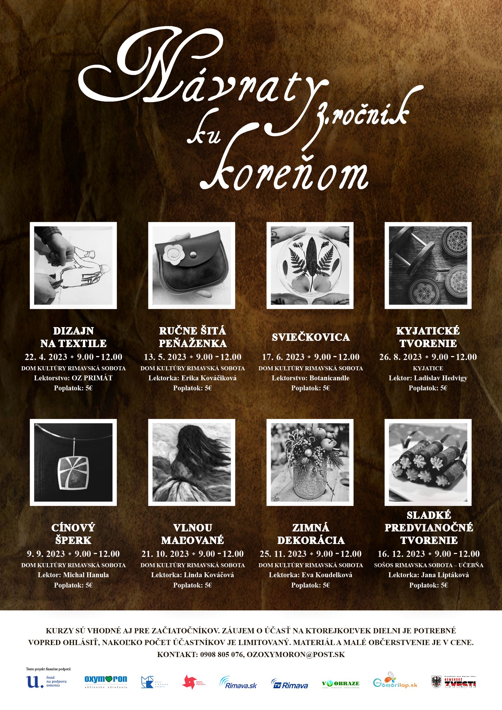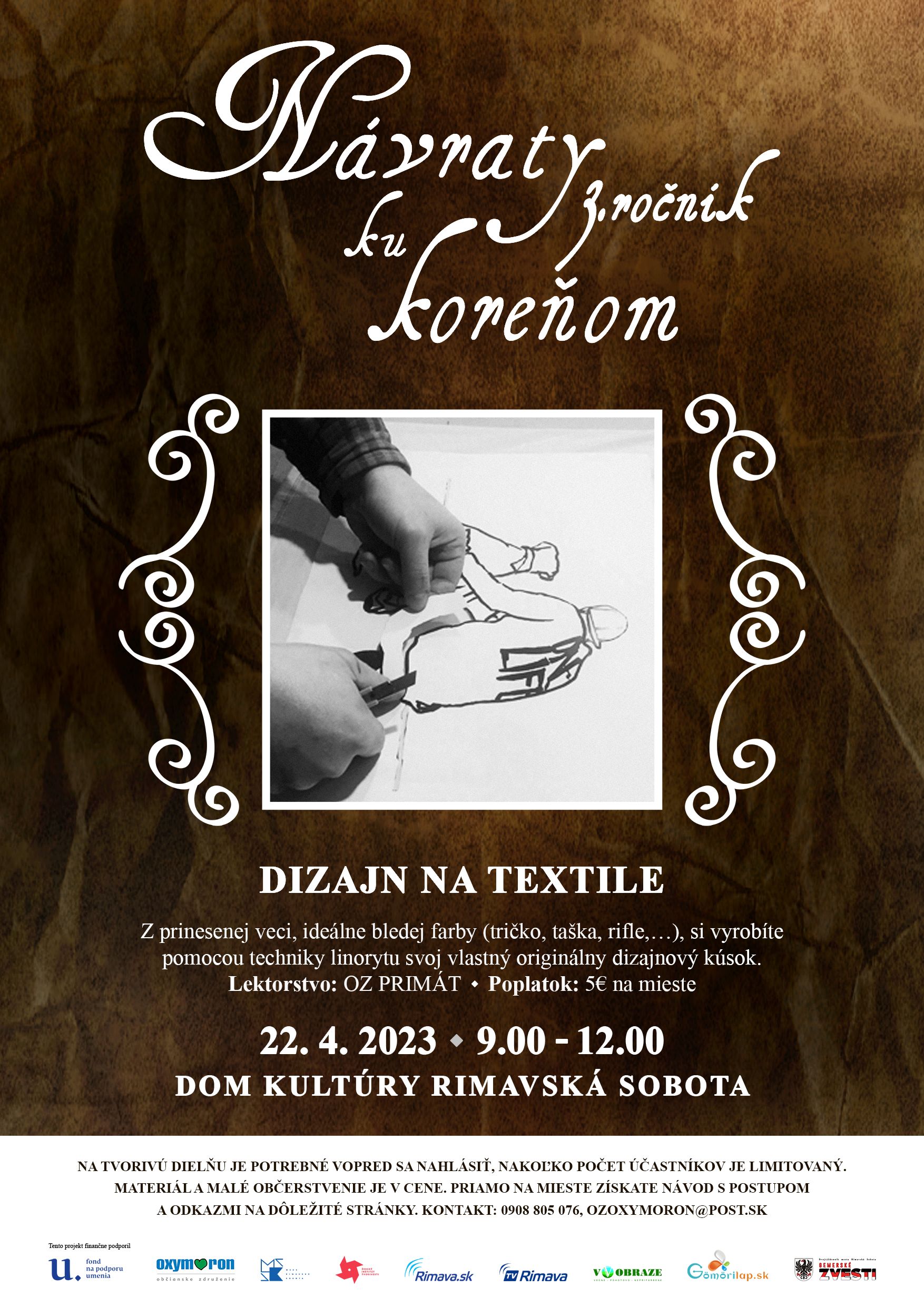 Prvým tvorivým stretnutím v rámci 3. ročníka projektu Návraty ku koreňom bude DIZAJN NA TEXTILE. V sobotu, 22. 4. 2023 si počas dopoludnia v čase 9.00 – 12.00 hod. v priestoroch DK v Rimavskej Sobote vytvoríte svoj vlastný originálny dizajnový kúsok. Projekt z verejných zdrojov podporil Fond na podporu umenia.