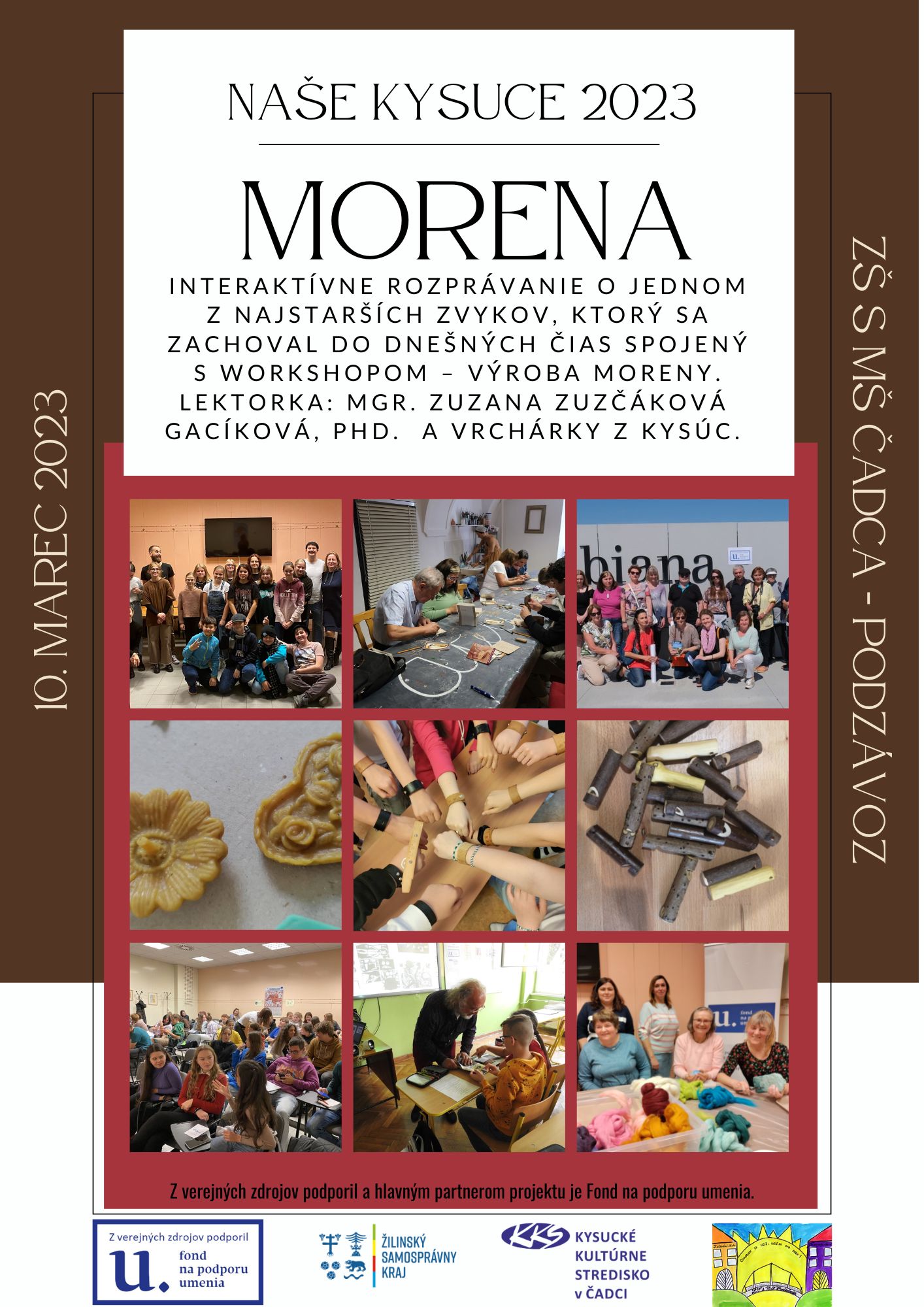 Kysucké kultúrne stredisko v Čadci, príspevková organizácia v zriaďovateľskej pôsobnosti Žilinského samosprávneho kraja, pripravilo pre detičky materskej škôlky v ZŠ s MŠ Čadci-Podzávoze interaktívne rozprávanie o jednom z najstarších zvykov, ktorý sa zachoval do dnešných čias spojený s workshopom – výrobou Moreny. Podujatie sa uskutočnilo v rámci projektu Naše Kysuce 2023. Projekt bol podporený z verejných zdrojov Fondu na podporu umenia.