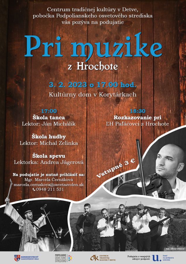 Pozývame vás na podujatie Pri muzike z Hrochote. Dňa 3. 2. 2023 sa v Kultúrnom dome v Korytárkach budeme učiť piesne, tanečné motívy a tiež základné štýlotvorné hudobné znaky hrochotskej muziky. Lektormi budú Ján Michálik a Katarína Galbičková, Michal Zelinka a Andrea Jágerová. Napokon si budete môcť rozkázať pri Ľudovej hudbe Paľáčovci z Hrochote. Tešíme sa na stretnutie s Vami. Podujatie z verejných zdrojov podporil FPU.