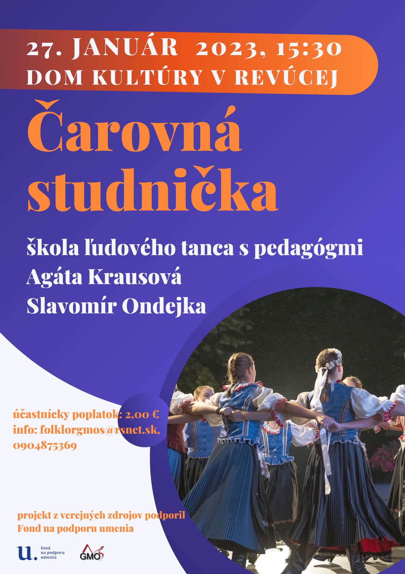 27.1.2023, Dom kultúrry v Revúcej od 15:30 Škola tanca s lektormi Agátou Krausovou a Slavomírom Ondejkom. Vyučovať sa budú tance z Rejdovej Čardáš, Palicový a ženské kolesá. Účastnícky poplatok je 2,00 €. Prihlášky na: folklorgmos@rsnet.sk, alebo na t.č. 0904875369. Tvorivá dielňa sa realizuje v rámci projektu Čarovná studnička, ktorý z verejných zdrojov podporil Fond na podporu umenia.