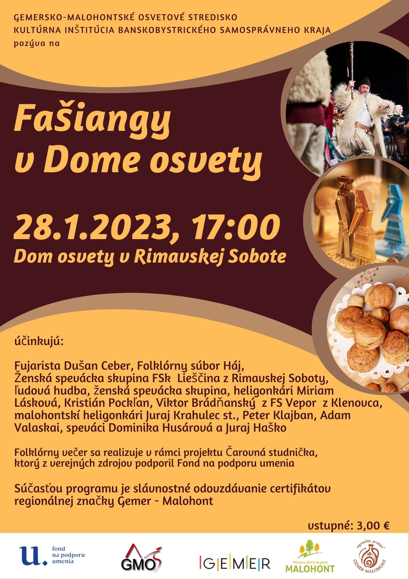 Fašiangy v Dome osvety v Rimavskej Sobote , v rámci ktorého budú slávnostne odovzdané certifikáty regionálnej značky Gemer - Malohont, 28.1.2023, 17:00. Podujatie sa realizuje v rámci projektu Čarovná studnička, ktorý z verejných zdrojov podporil Fond na podporu umenia.