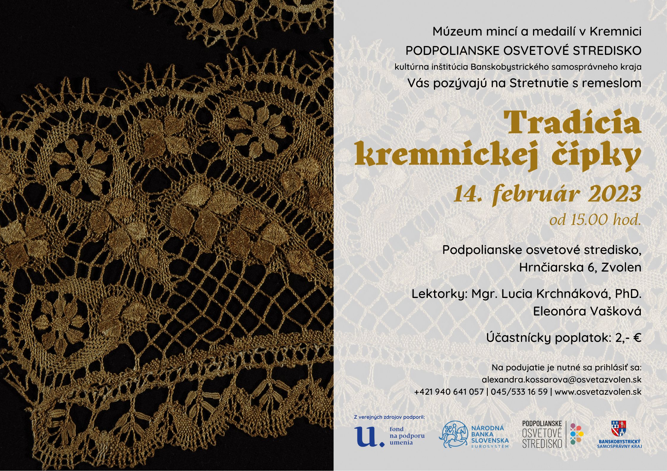 V spolupráci s Múzeom mincí a medailí Kremnica sme pripravili ďalšie Stretnutie s remeslom. Rozprávať o tradícii paličkovanej čipky v Kremnici bude Mgr. Lucia Krchnáková, PhD., praktickú ukážku predvedie Eleonóra Vašková. Tešíme sa na stretnutie s vami. Podujatie sa uskutoční v našej remeselnej dielni, 14. februára 2023 o 15.00 hod. Účastnícky poplatok: 2,- € Z verejných zdrojov podporil Fond na podporu umenia.