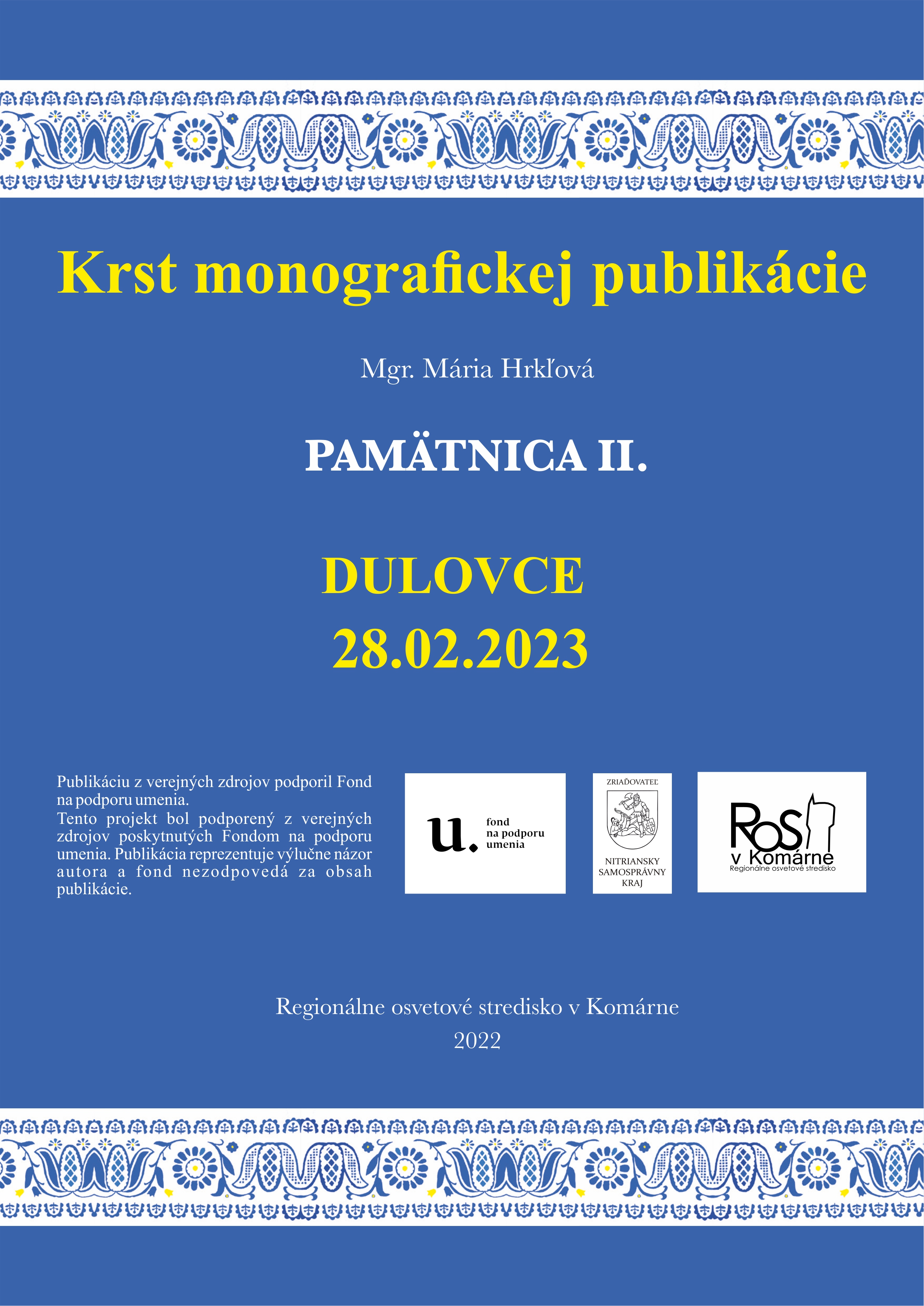 Regionálne osvetové stredisko v Komárne pripravuje krst monografickej publikácie Pamätnica II., ktorý sa koná 28. 02. 2023 od 10:00 do 11:00 na Základnej škole, Starohorská 8 v Dulovciach. Publikáciu z verejných zdrojov podporil Fond na podporu umenia. Tento projekt bol podporený z verejných zdrojov poskytnutých Fondom na podporu umenia. Publikácia reprezentuje výlučne názor autora a fond nezodpovedá za obsah publikácie.
