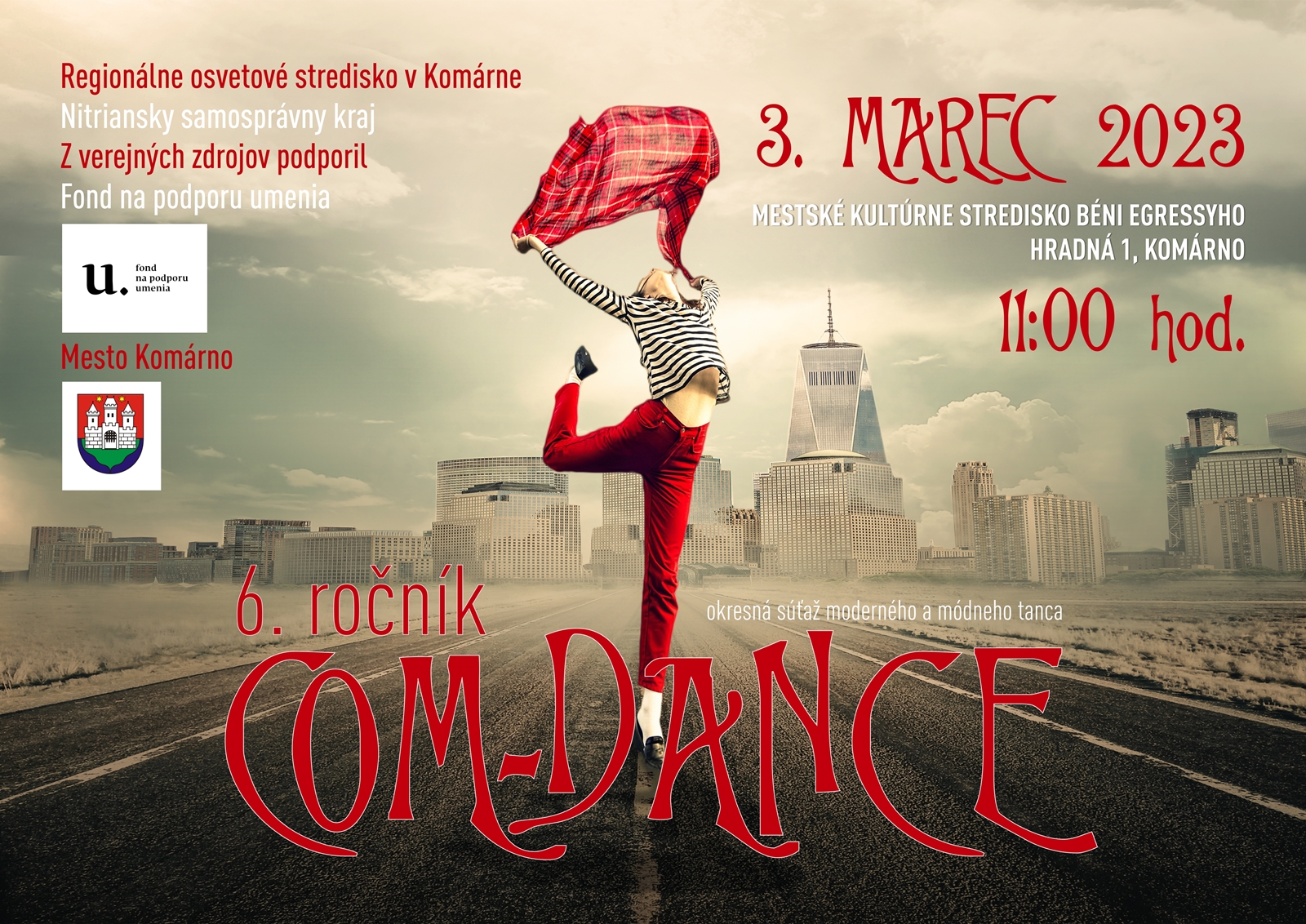 Regionálne osvetové stredisko v Komárne pripravuje okresnú súťaž moderného a módneho tanca 6. ročník COM-DANCE, ktorá je regionálnym kolom celoštátnej postupovej súťažnej prehliadky moderného a módneho tanca Deň tanca 2023. Súťaž sa bude konať 3. marca 2023 od 10:00 do 16:00 v priestoroch Mestského kultúrneho strediska Béni Egressyho, Hradná 1, Komárno. Z verejných zdrojov podporil Fond na podporu umenia
