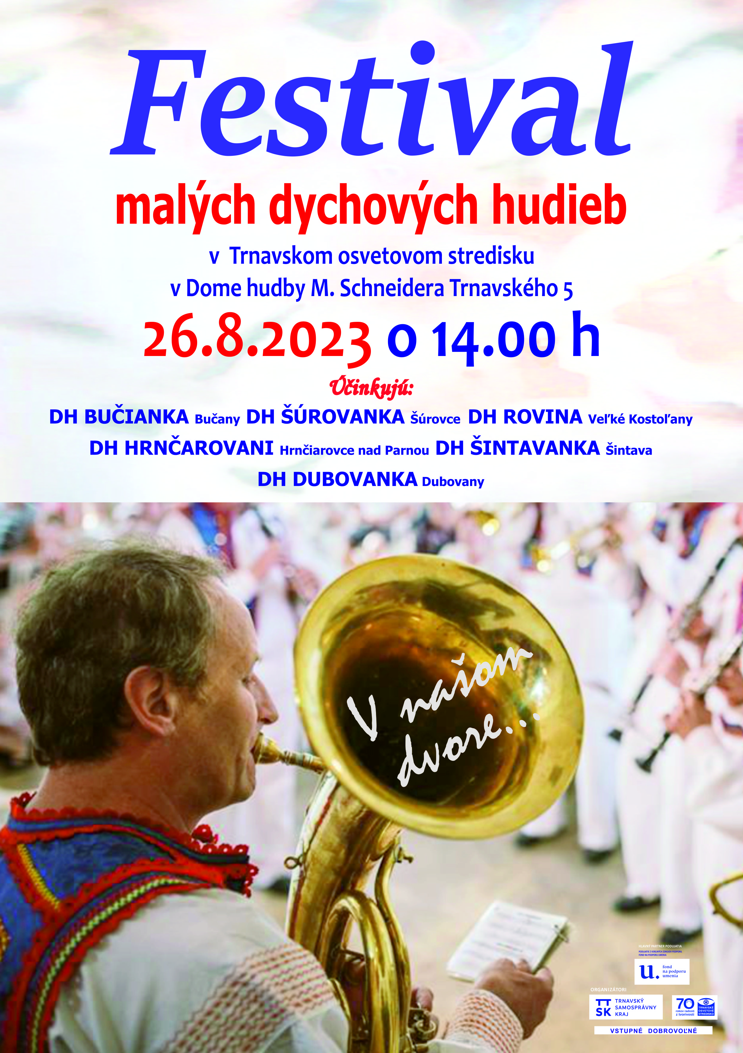 Trnavské osvetové stredisko v spolupráci s Trnavským samosprávnym krajom bude organizovať v septembri 2023 už 15. ročník Festivalu malých dychových hudieb. Festivalom upriamujeme pozornosť verejnosti v trnavskom regióne na bohatú tradíciu dychovej hudby, ktorá sa rozvinula na kvalitnú interpretačnú a aj autorskú úroveň. Festival malých dychových hudieb je podujatím žánra dychových hudieb, pokračuje v nadväznosti na hudobné tradície svojich predkov, v generačnej výmene muzikantov i spevákov.