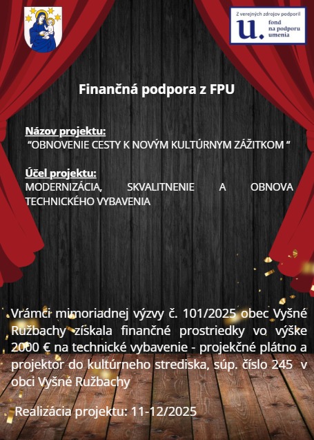 Obec Vyšné Ružbachy vrámci mimoriadnej výzvy č. 101/2025 získala finančné prostriedky na projekt: Obnovenie cesty k novým kultúrnym zážitkom " za účelom Modernizácie, skvalitnenia a obnovu technického vybavenie na zakúpenie technického vybavenia - projekčné plátno a projektor do kultúrneho strediska, súpisné číslo 245 v obci Vyšné Ružbachy. Výška dotácie je vo výške 2000 €.