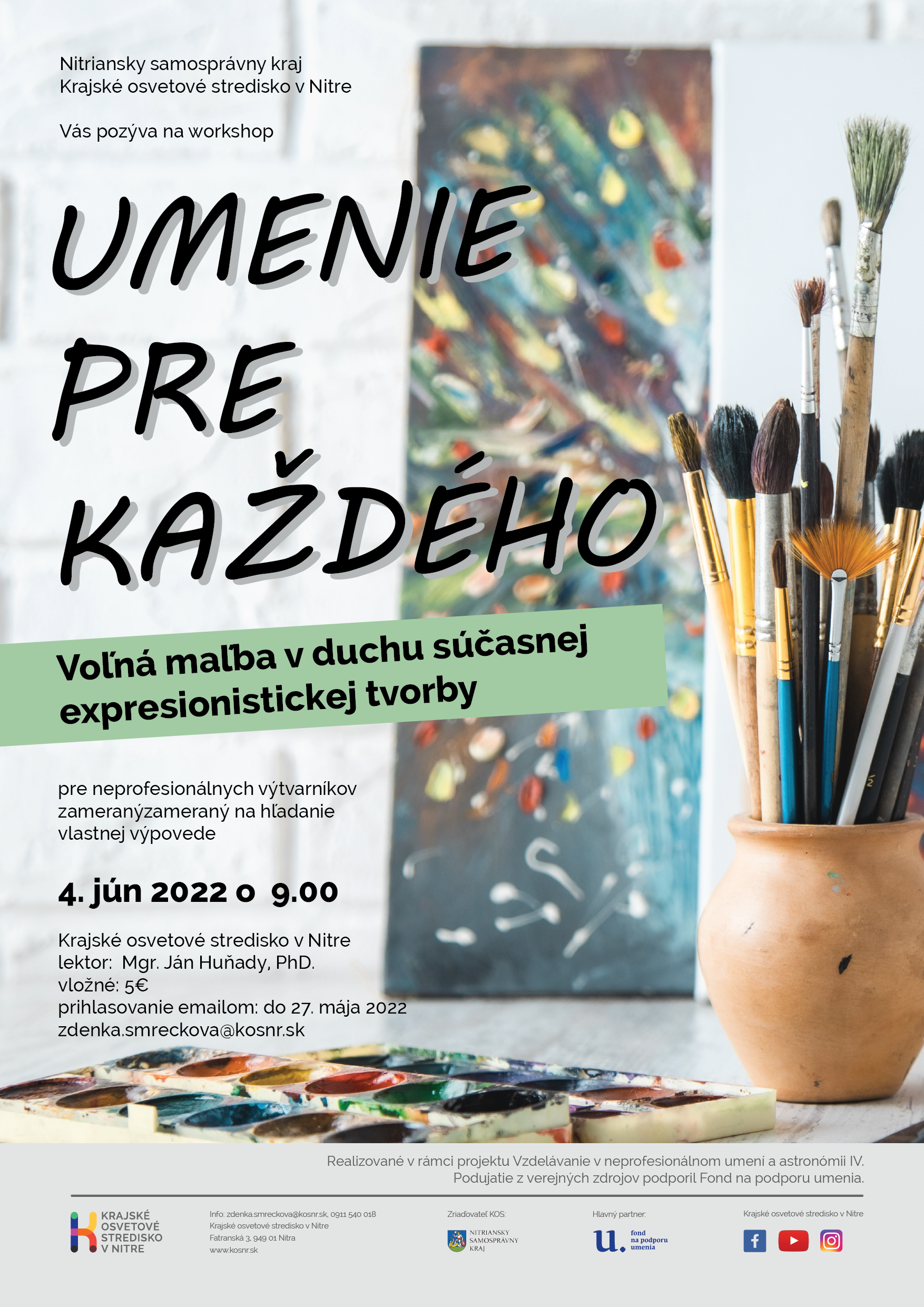 UMENIE PRE KAŽDÉHO – VOĽNÁ MAĽBA V DUCHU SÚČASNEJ EXPRESIONISTICKEJ TVORBY výtvarný workshop pre neprofesionálnych výtvarníkov zameraný na voľnú maľbu v duchu súčasnej expresionistickej tvorby a na hľadanie vlastnej výpovede kde: : Krajské osvetové stredisko v Nitre lektor: Mgr. Ján Huňady, PhD.