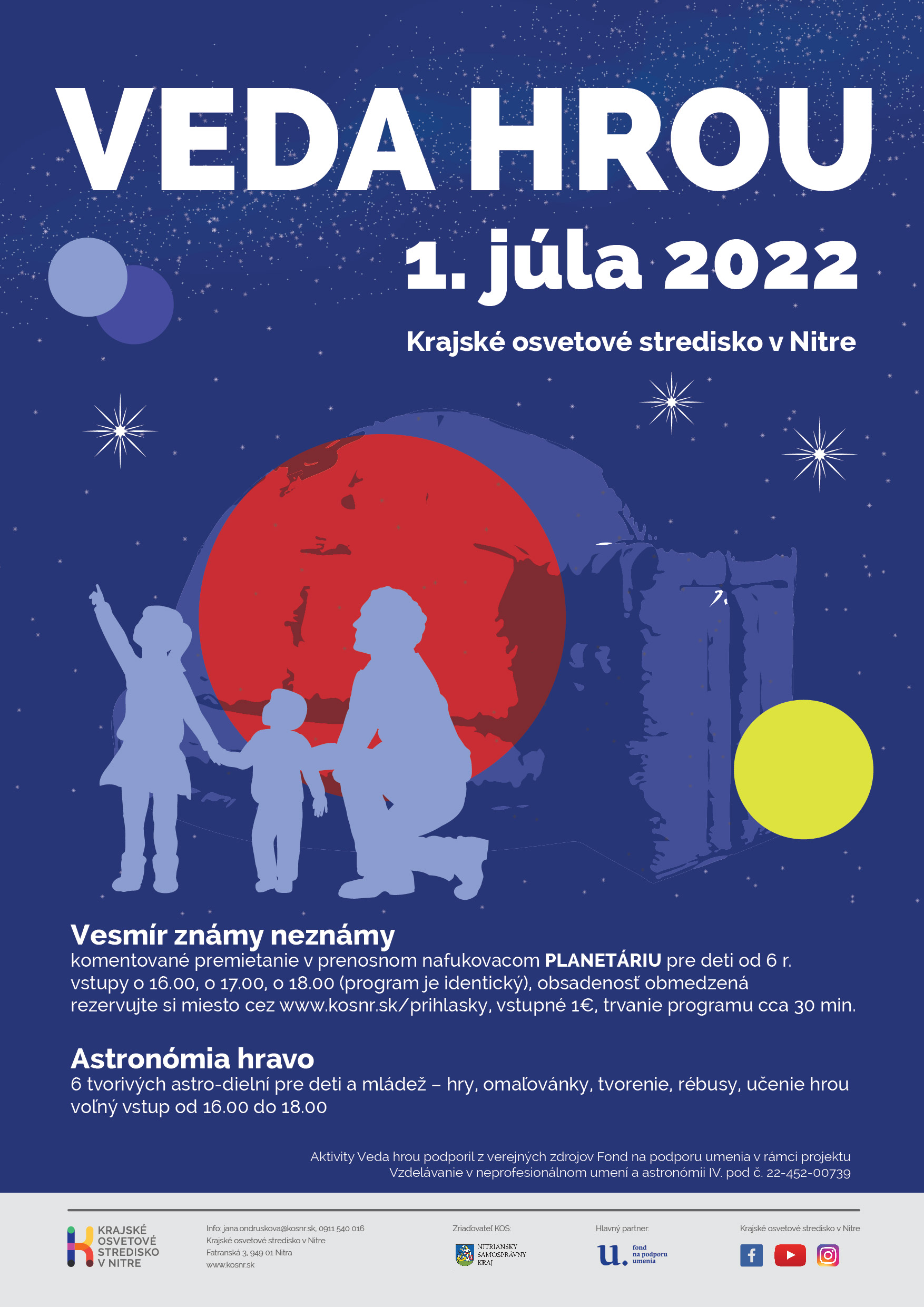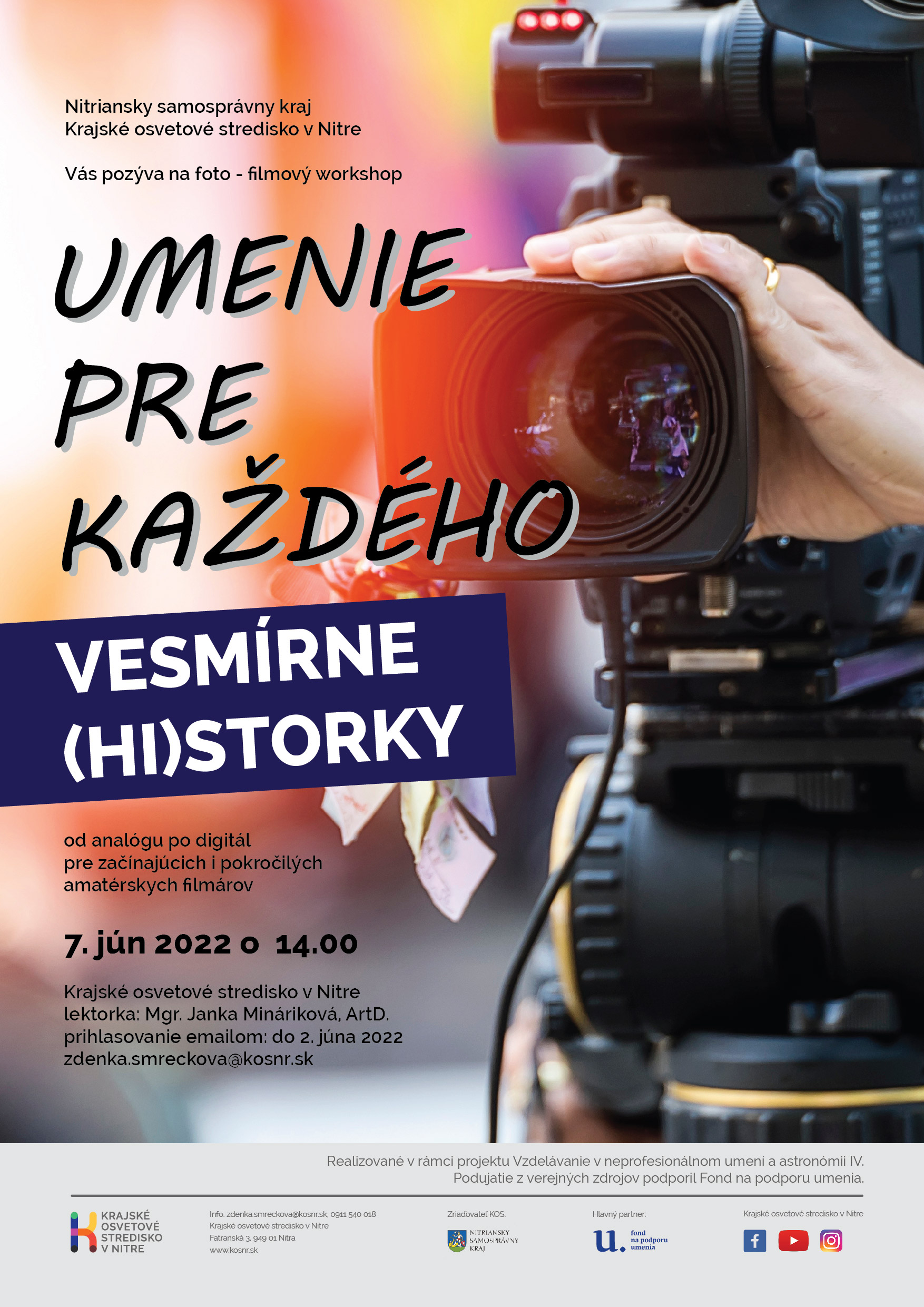 7. 6. 2022 UMENIE PRE KAŽDÉHO – VESMÍRNE (HI)STORKY - OD ANALÓGU PO DIGITÁL foto-filmový workshop pre začínajúcich i pokročilých amatérskych filmárov - pre pozemských mimozemšťanov od 10 do 100 rokov kde: : Krajské osvetové stredisko v Nitre lektor: Mgr. Janka Mináriková, ArtD.