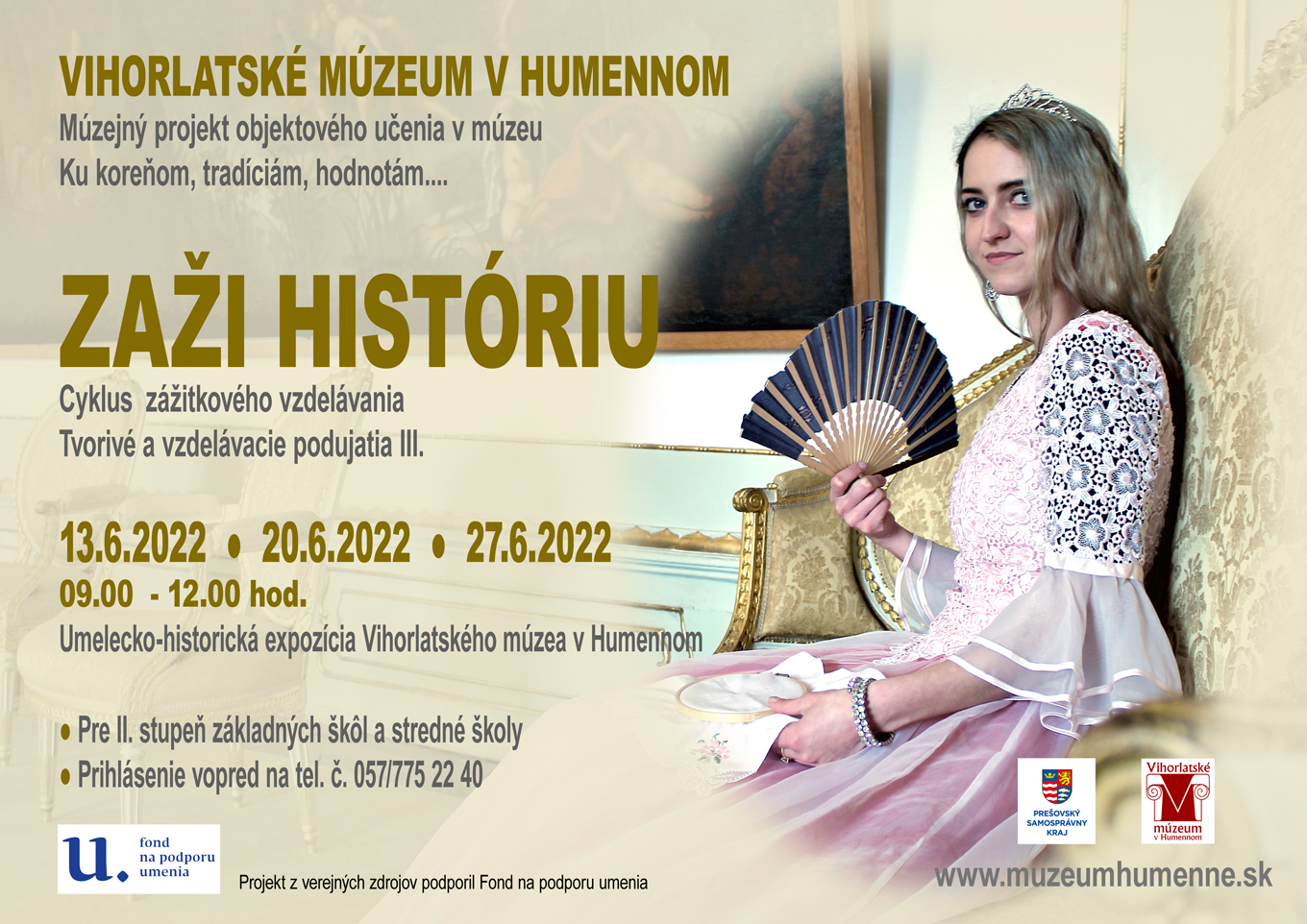 „Zaži históriu“- názov cyklu zážitkového vzdelávania v kaštieli v Humennom so zameraním na žiakov a študentov ZŠ a SŠ. V rámci interaktívnej prehliadky dobového interiéru renesančného kaštieľa budú môcť zažiť ukážku každodenného života šľachtického páru žijúceho na typickom šľachtickom dvore 19. storočia (stolovanie, odievanie, hry a pod.) v súčinnosti s účastníkmi aktivity.