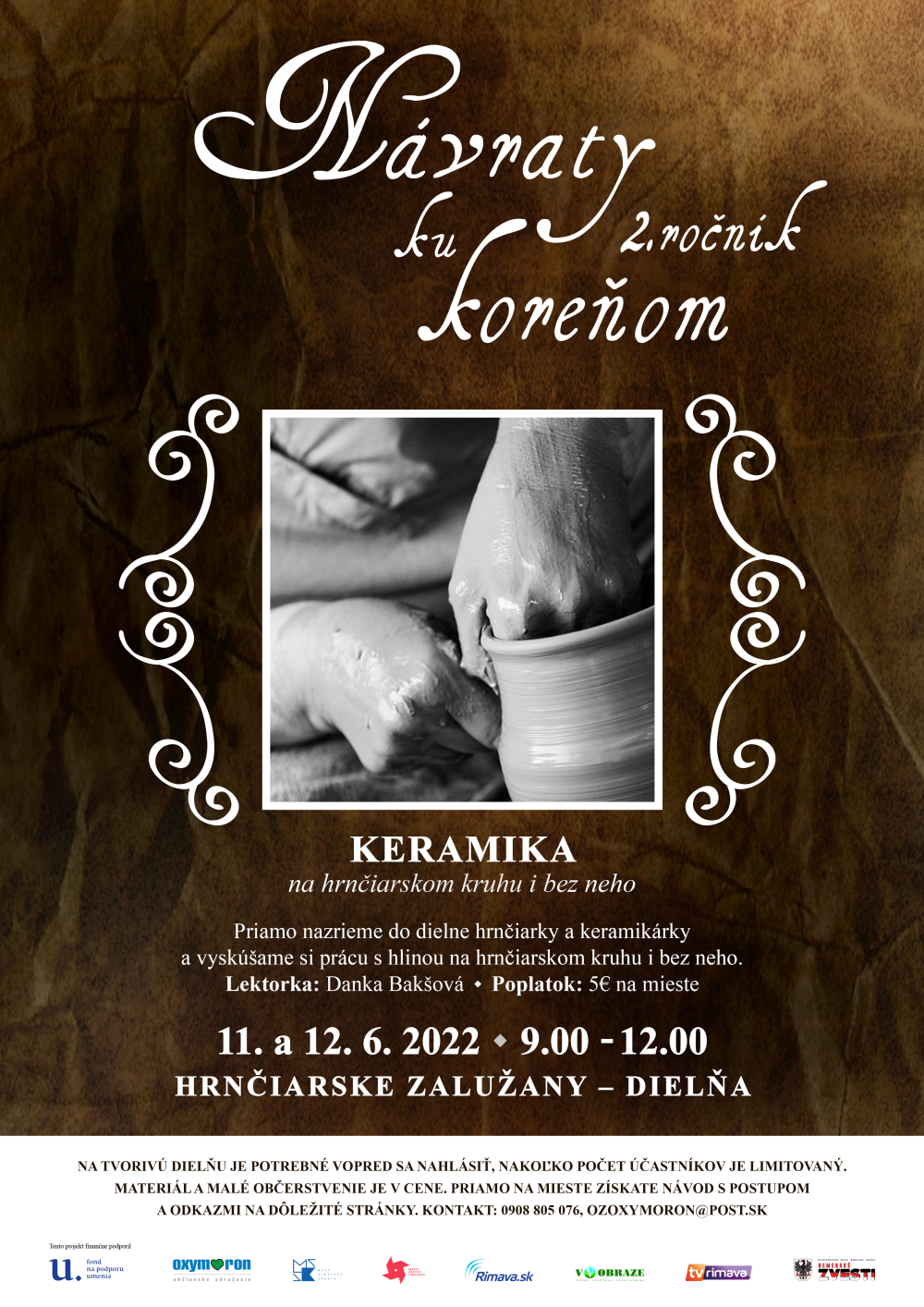 Témou tretej tvorivej dielne projektu Návraty ku koreňom 2 bude KERAMIKA. Priamo nazrieme do dielne hrnčiarky a keramikárky Danky Bakšovej a vyskúšame si prácu s hlinou na hrnčiarskom kruhu i bez neho. Všetkých záujemcov pozývame v sobotu 11. alebo v nedeľu 12. 6. 2022 v čase od 9.00 do 13.00 hod. na tvorivú dielňu do Hrnčiarskych Zalužian.
