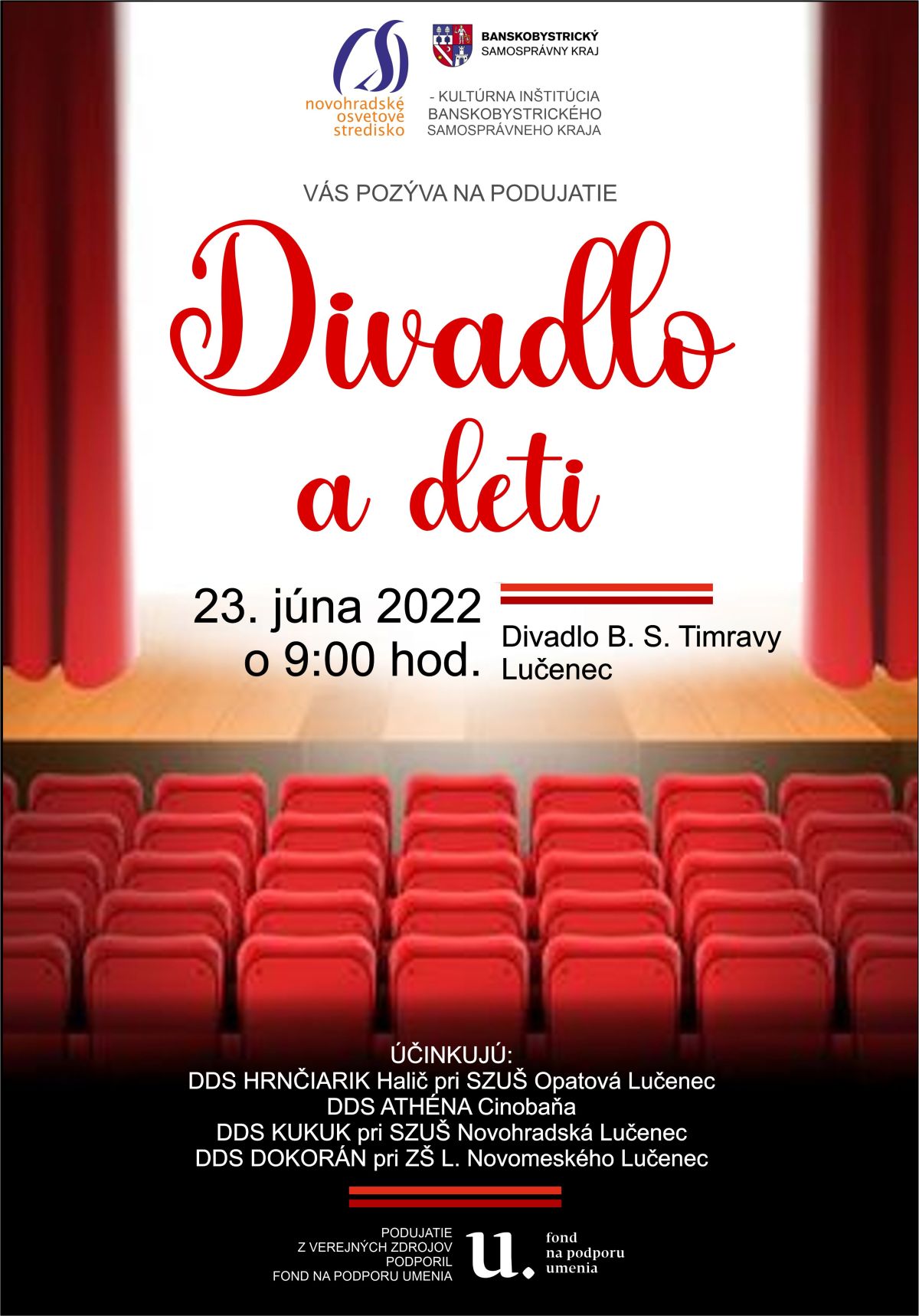 V rámci podujatia Divadlo a deti zrealizujeme divadelné vystúpenia venované detskému divadlu pre deti a ich vedúcich s cieľom dať priestor k prezentácii, vzájomnej konfrontácii a následne prebehne dielňa venovaná rozboru vystúpení a odbornému usmerneniu.