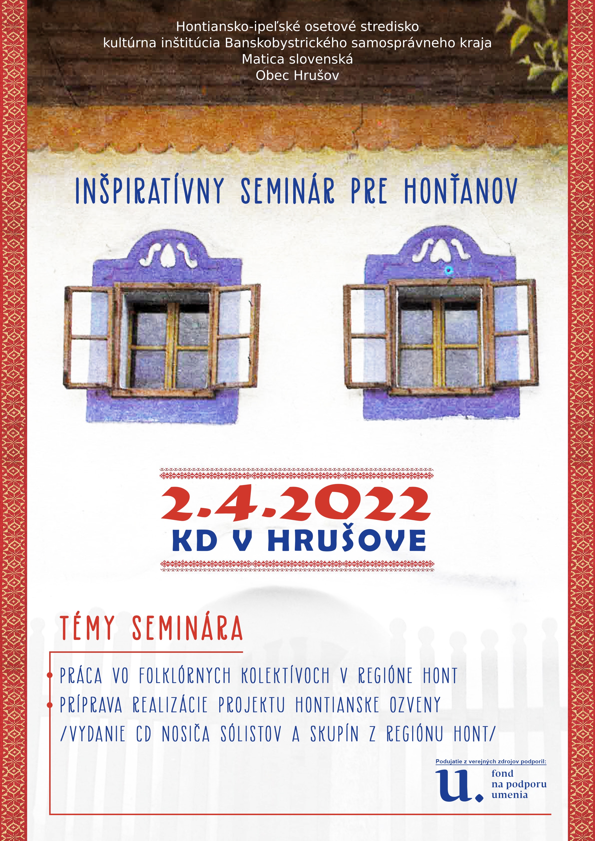 Seminár pre vedúce osobnosti a členov folklórnych kolektívov, manažérov/ky, zamestnancov/kyne inštitúcií a organizácií pôsobiacich v oblasti kultúry v regióne Hont, ale aj mimo neho, s cieľom skvalitňovať prácu folklórnych kolektívov, zvyšovať ich umelecký a odborný rast v problematike výstavby a tvorby folklórnych programov.