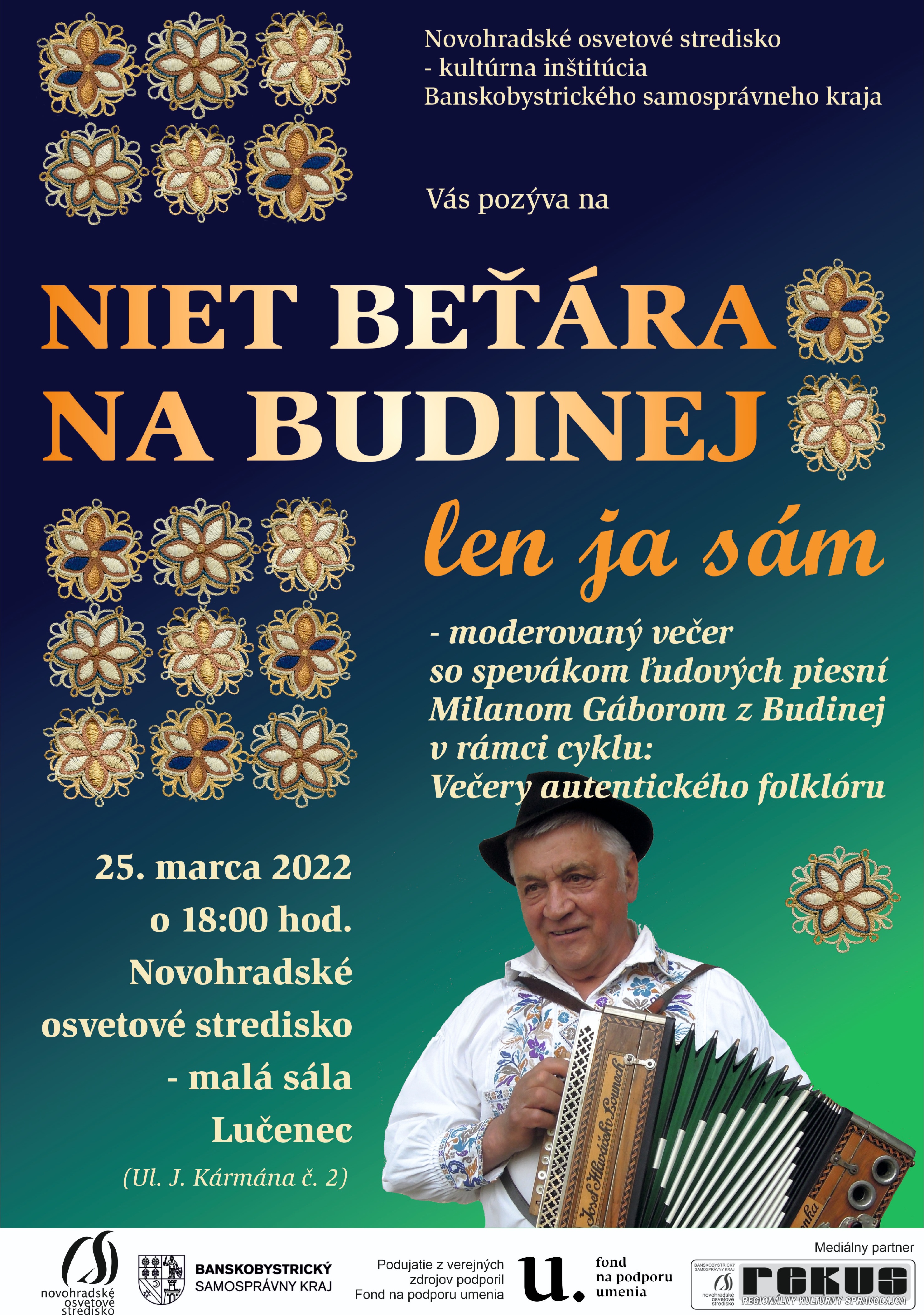 Prvý z cyklu Večerov autentického folklóru. Hosťom bude Milan Gábor z Budinej a ďalší folkloristi.