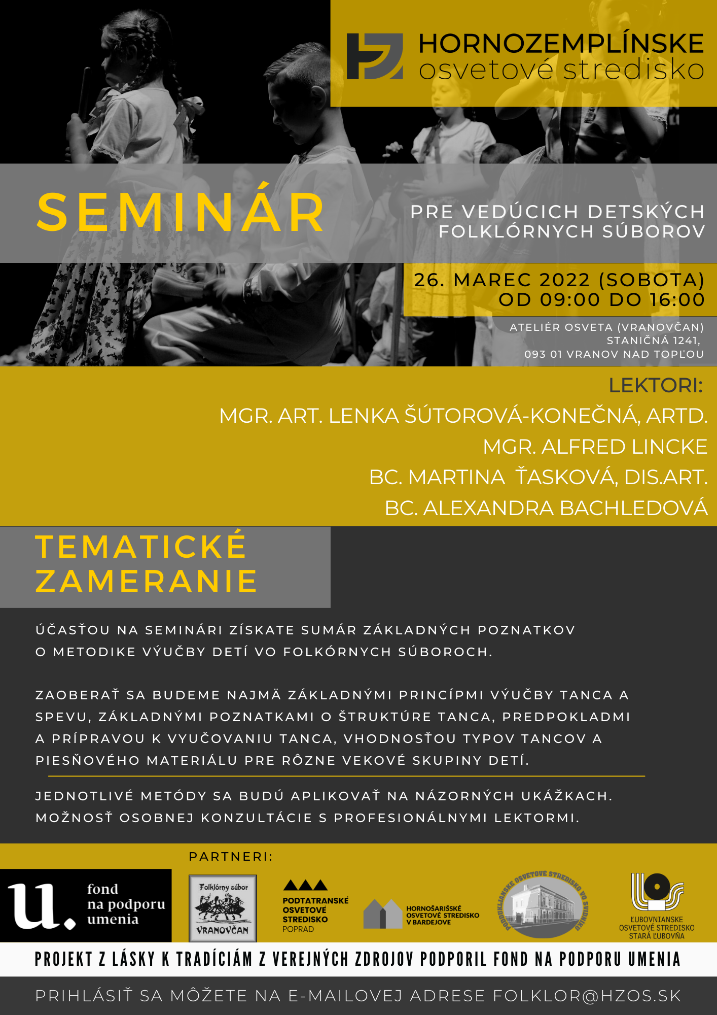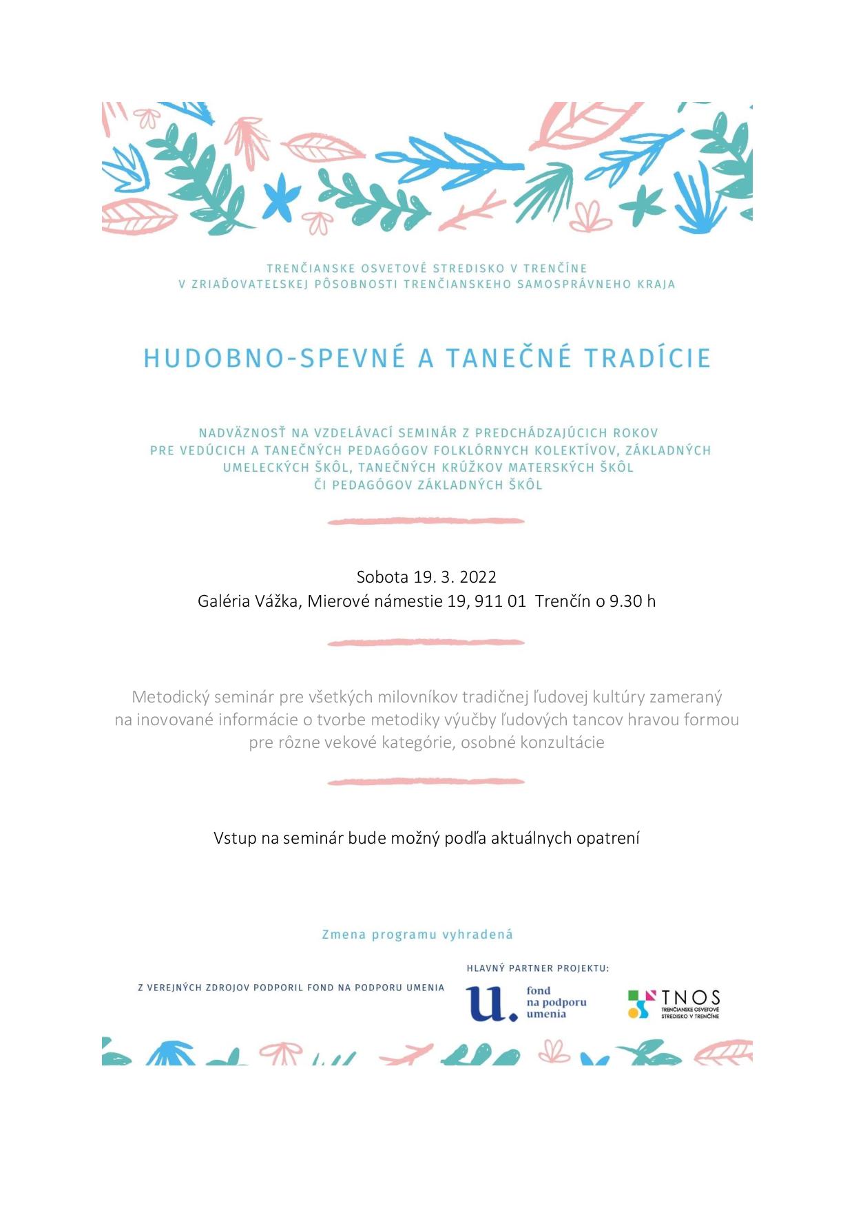 Trenčianske osvetové stredisko v Trenčíne v nadväznosti na vzdelávacie semináre z predchádzajúcich rokov pripravuje HUDOBNO-SPEVNÉ A TANEČNÉ TRADÍCIE pre vedúcich a tanečných pedagógov folklórnych kolektívov, základných umeleckých škôl, tanečných krúžkov materských škôl či pedagógov základných škôl.
