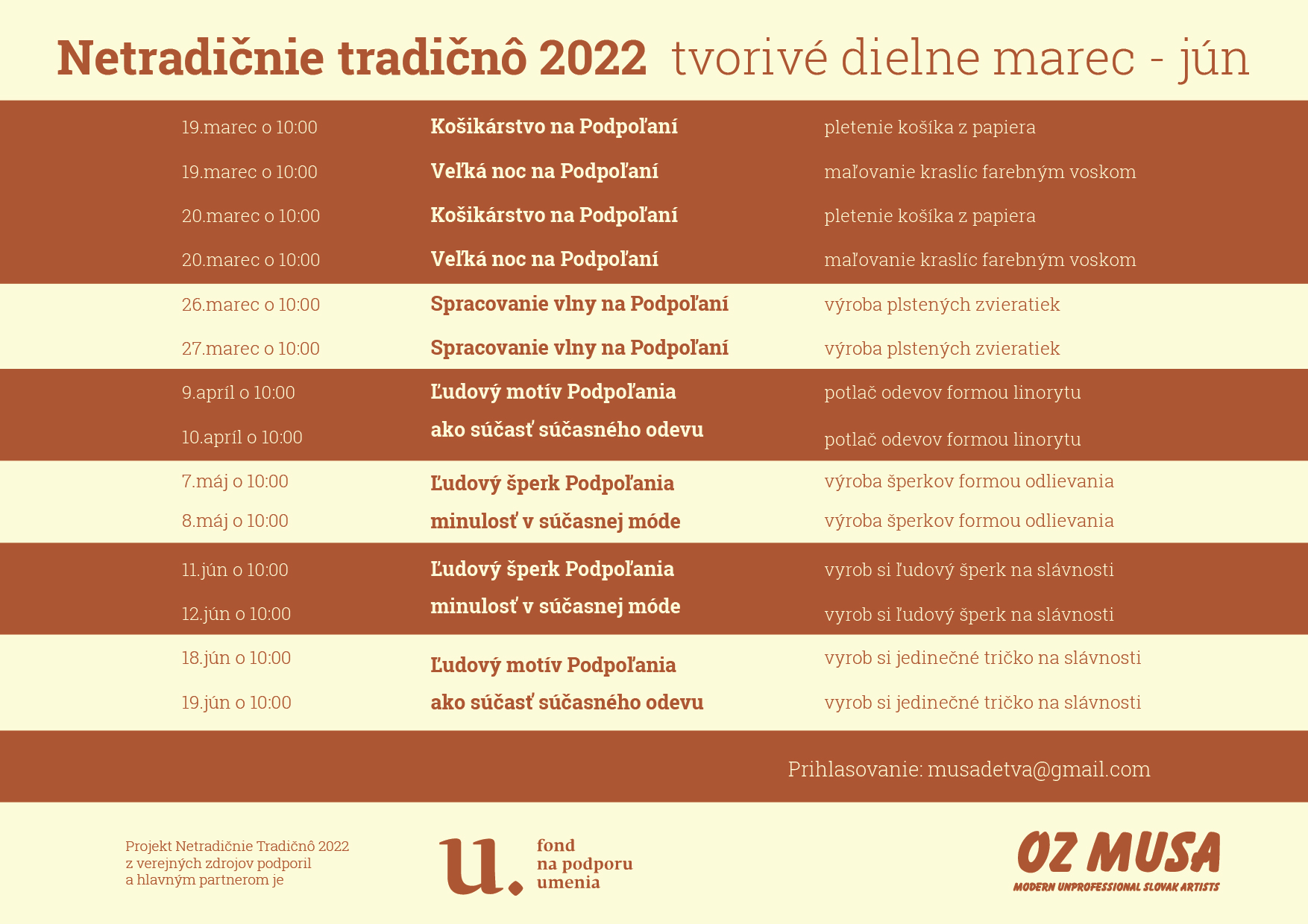 Netradičnie Tradičnô je séria tvorivých dielní OZ MUSA, v ktorých sa naučíte využívať tradičné zručnosti Podpoľania netradičným spôsobom tak, aby ste výrobky využili v bežnom živote.