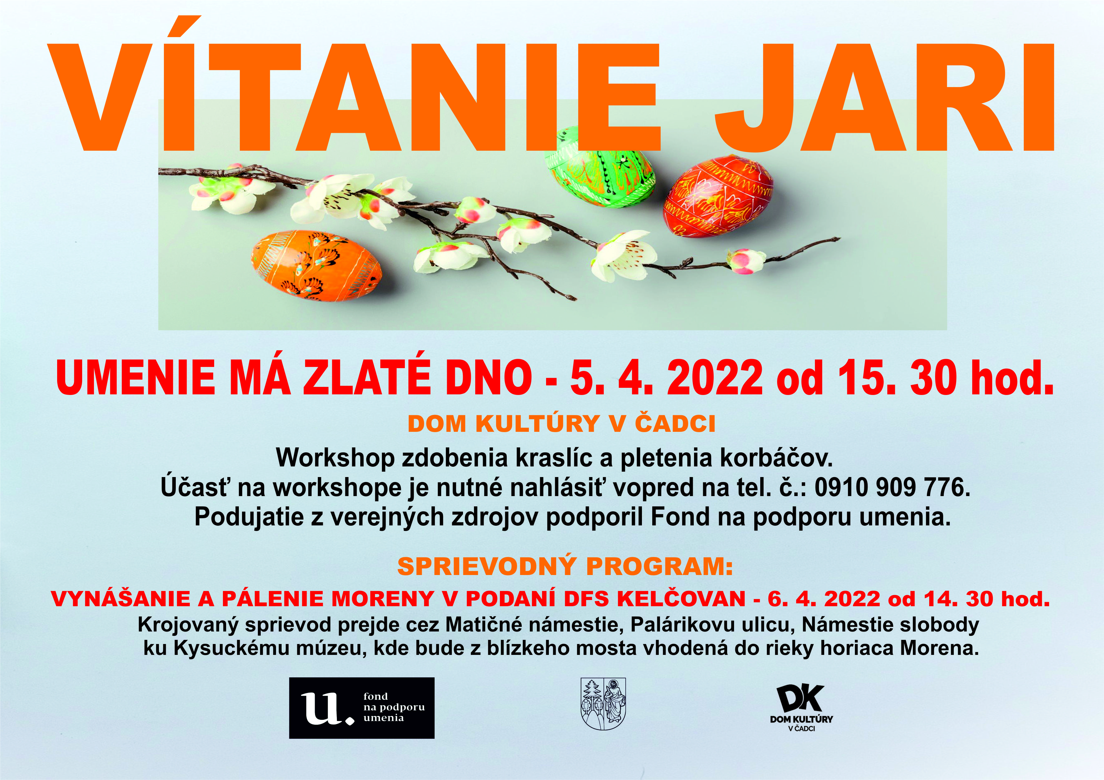 Zámerom projektu je ponúknuť cieľovej skupine obohatenie sa umením, ktoré bude sprostredkované tvorivými remeselnými dielňami -Vítanie jari, zameraných na zdobenie veľkonočných kraslíc, pletenie korbáčov a to v Dome kultúry v Čadci. Zárukou kvality budú odborní lektori v danej oblasti.