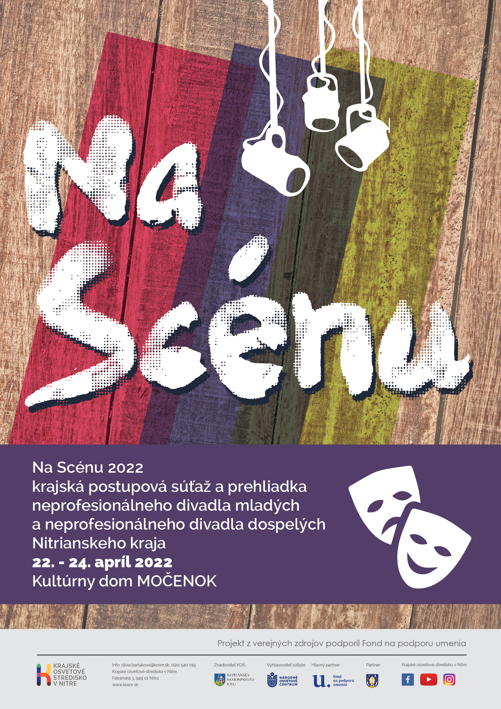 Na Scénu 2022,krajská postupová súťaž a prehliadka neprofes.divadla mladých a divadla dospelých Nitrianskeho kraja Predstaví sa 9 divadelných inscenácií, 8 súťažných a 1 hosť z Poľska Divadlo TERMINUS A QUO. Nová Sóľ. Súťaž je realizovaná v kategórii: divadlo mladých a divadlo dospelých. Súčasťou sú rozborové semináre s porotou k odohraným inscenáciám. Sprievodným podujatím je výstava „Na Scénu v spomienkach”. Vzdelávacou časťou je divadelný workshop s R.Piovarčíkom, performerom a tanečníkom