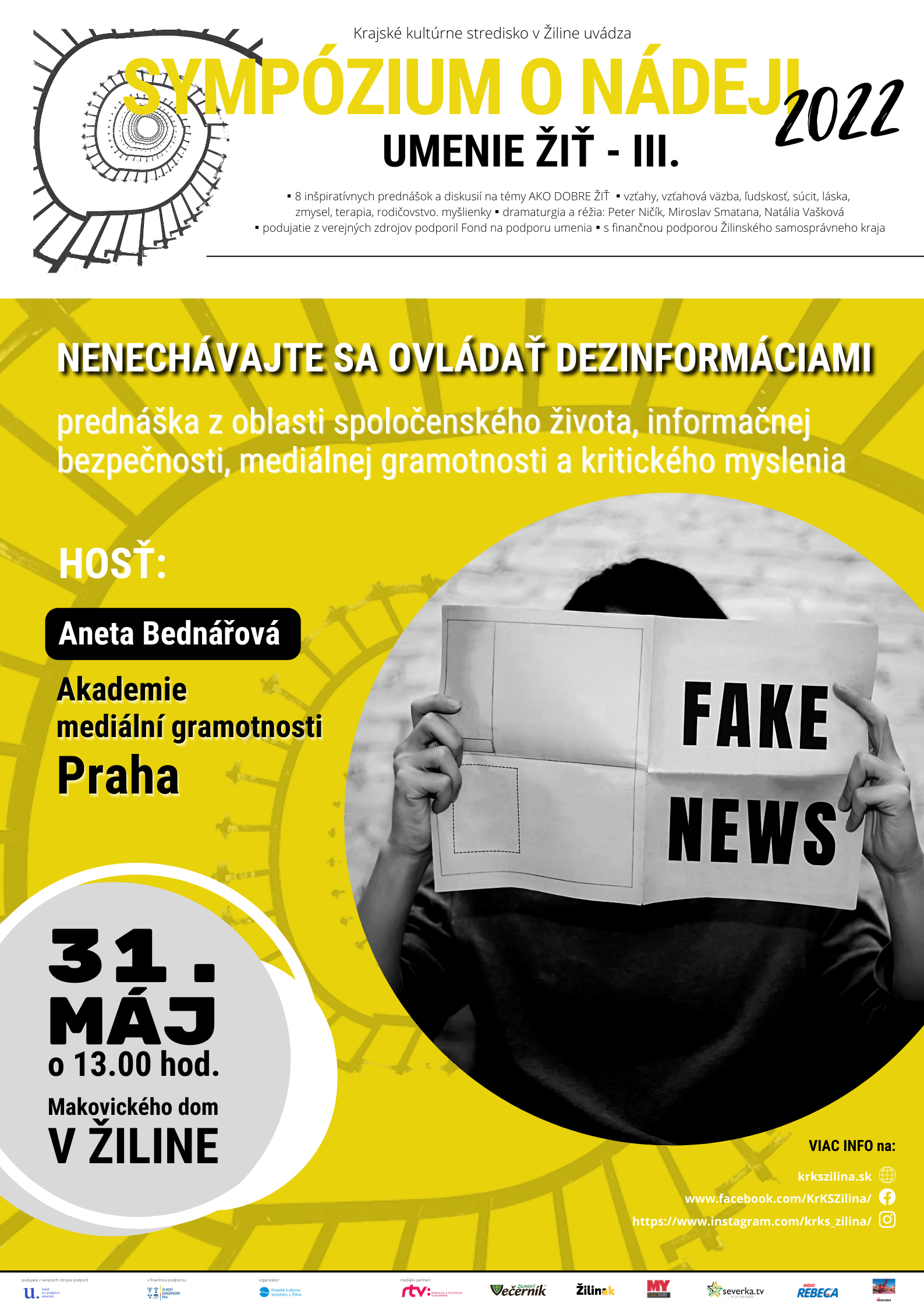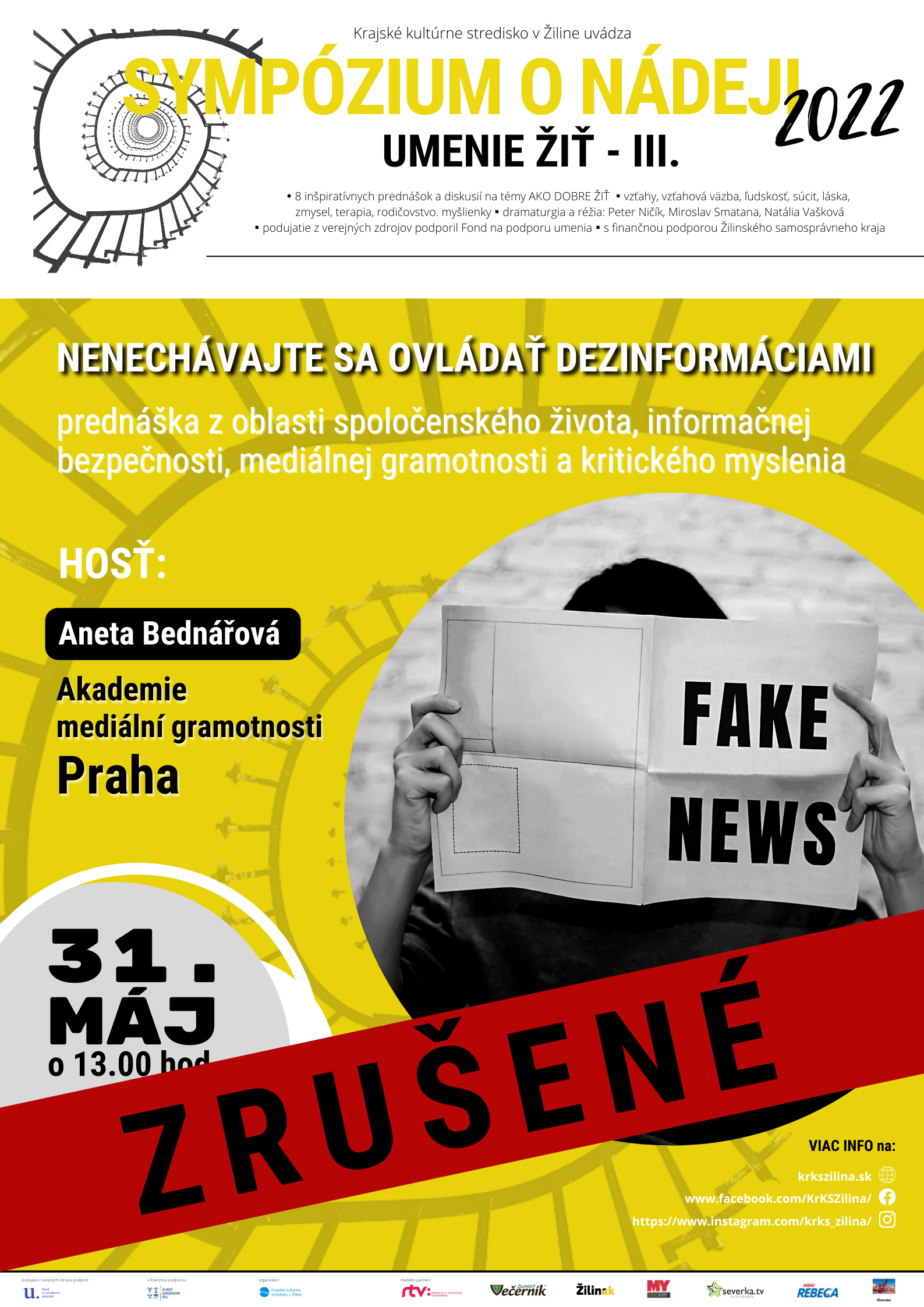 ! PODUJATIE ZRUŠENÉ ! Prednáška v rámci SYMPÓZIA O NÁDEJI 2022 – UMENIE ŽIŤ III. na tému NENECHAJTE SA OVLÁDAŤ DEZINFORMÁCIAMI sa zo zdravotných dôvodov lektorky nekoná.