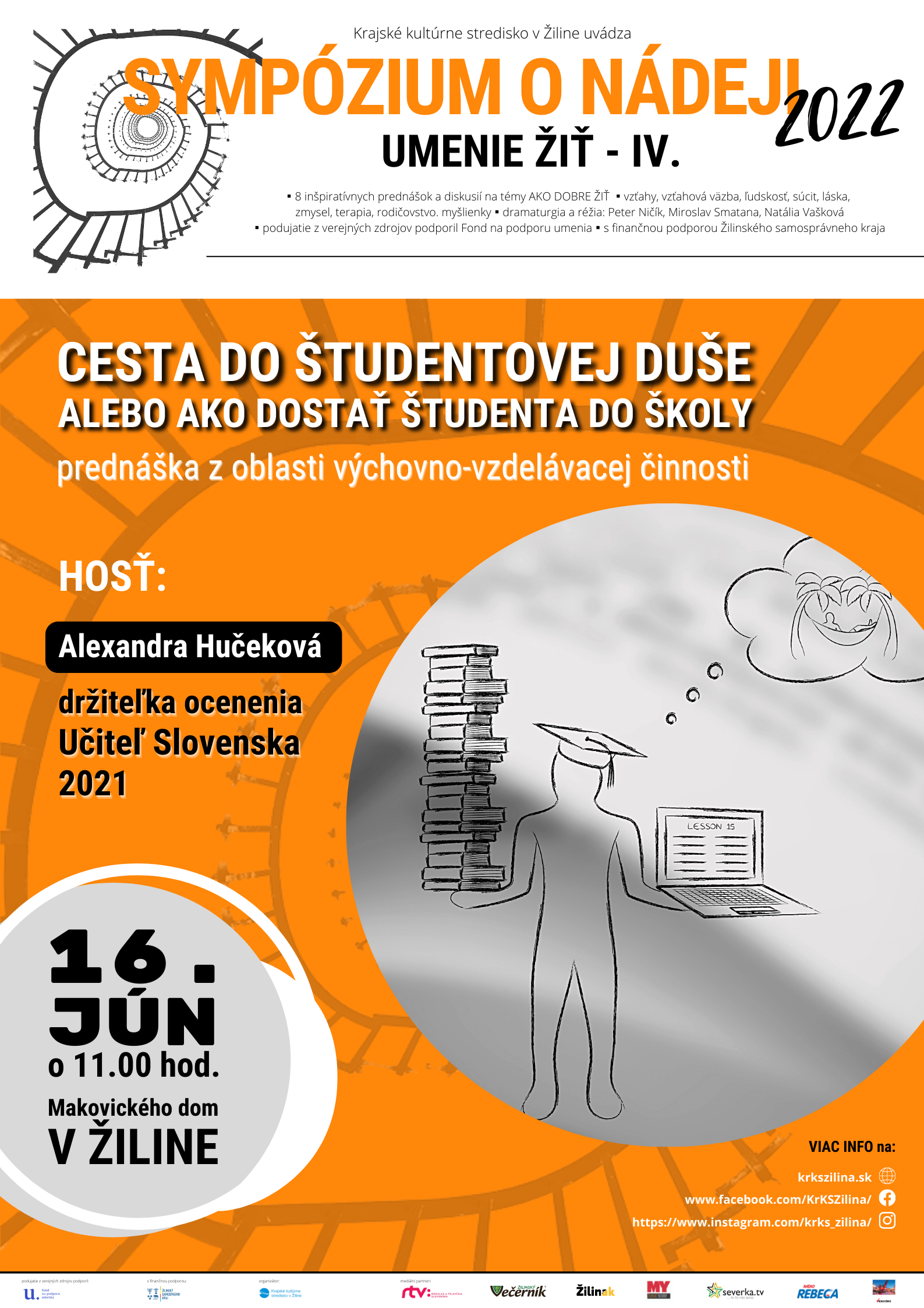 Prednáška s názvom CESTA DO ŠTUDENTOVEJ DUŠE ALEBO AKO DOSTAŤ ŠTUDENTA DO ŠKOLY sa uskutoční 16. júna 2022 o 11.00 hod. v podkroví Makovického domu v Žiline. Lektorka Alexandra Hučeková je vedúca súkromného vzdelávacieho centra Babylon Education v Žiline. V jazykovej škole, ktorá ponúka širokú škálu kurzov je lektorkou nemeckého jazyka. Novými, inovatívnymi spôsobmi a interaktívnou formou sa snaží učiť aj svojich žiakov na Gymnáziu Varšavská cesta v Žiline.
