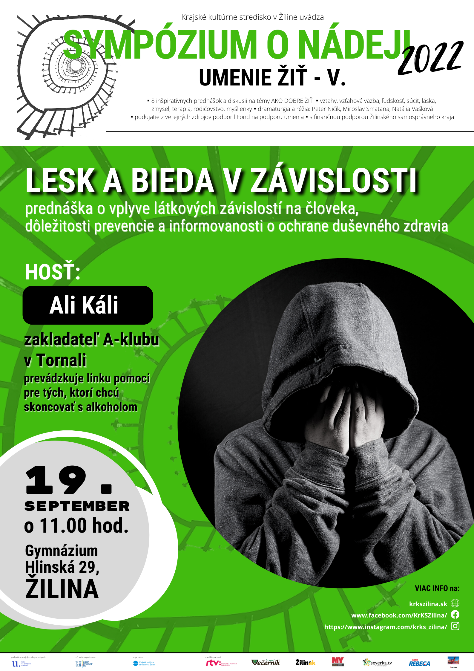 SYMPÓZIUM O NÁDEJI 2022 – UMENIE ŽIŤ V. Prednáška pre študentov stredných škôl s názvom LESK A BIEDA V ZÁVISLOSTI zameraná na neľahkú problematiku látkových závislostí.