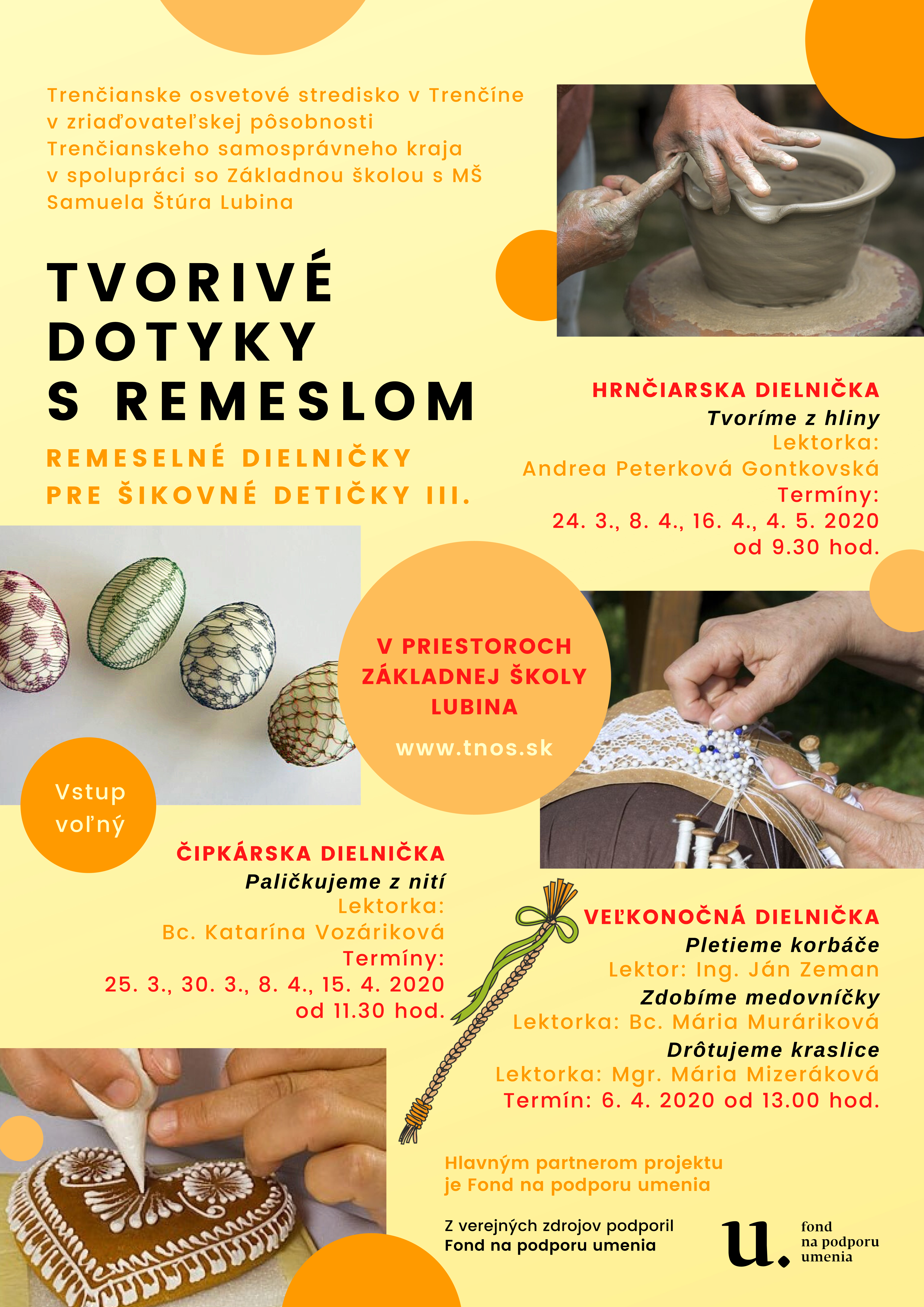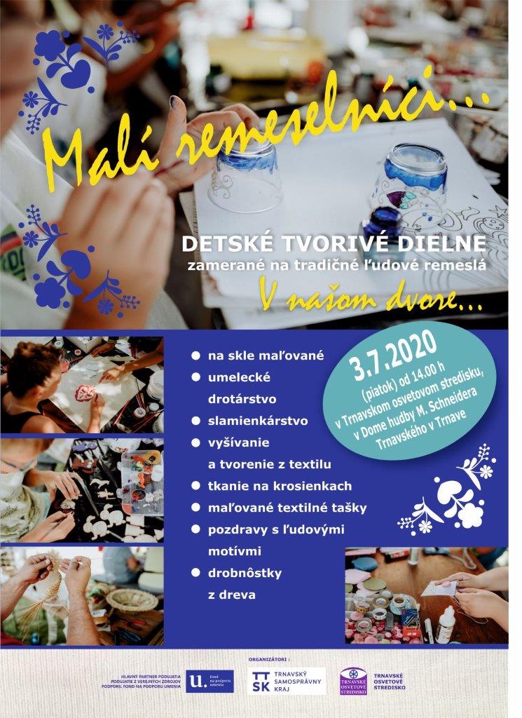 X. ročník tvorivých prázdninových dielní Malí remeselníci sme v tomto roku situovali do nových priestorov Trnavského osvetového strediska v Trnave. Jednodňové remeselné dielne sa budú skladať z ôsmich dielničiek a budú zamerané na rôzne techniky tradičných ľudových remesiel.