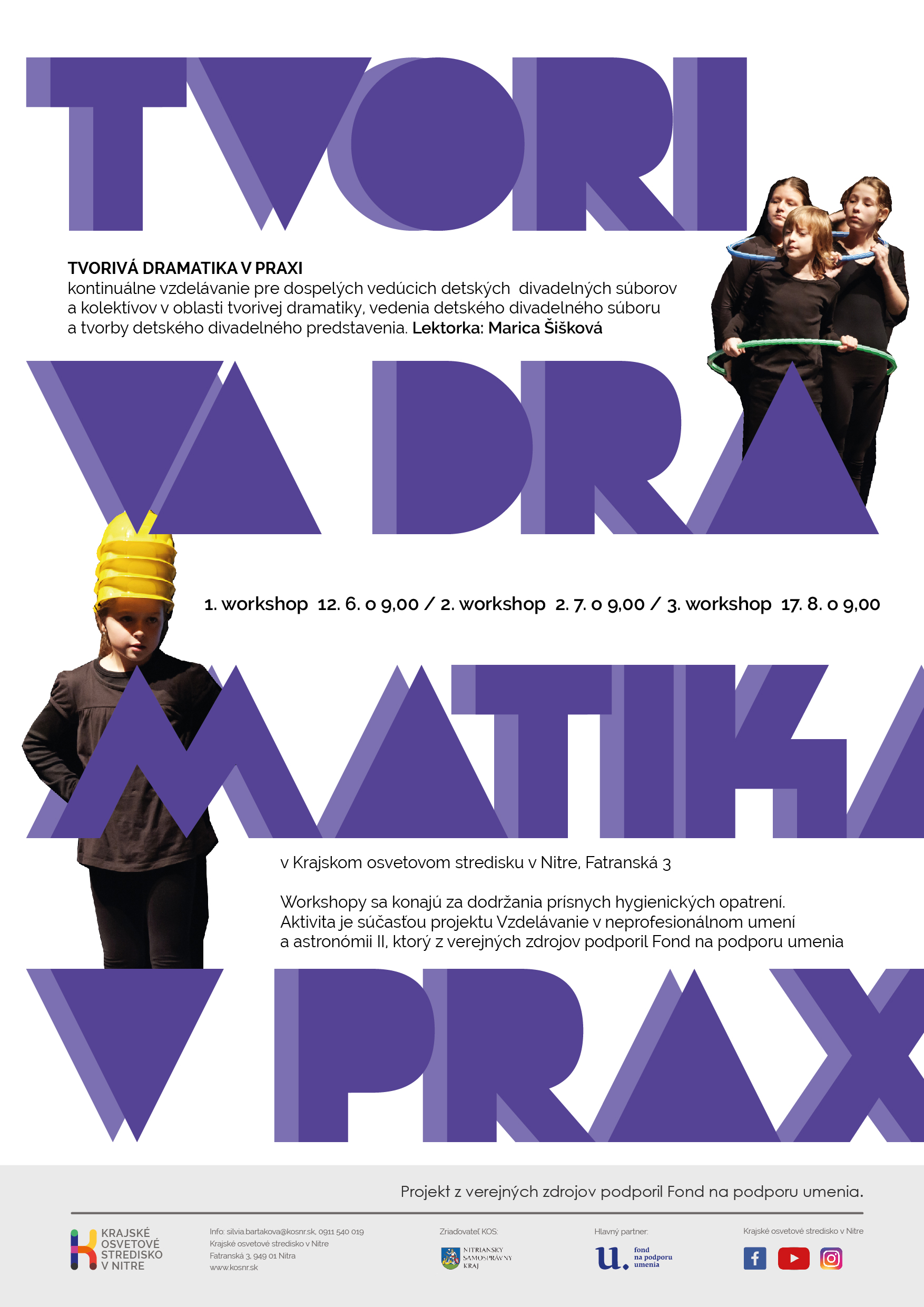 TVORIVÁ DRAMATIKA V PRAXI. Krajské osvetové stredisko v Nitre pripravuje kontinuálne vzdelávanie pre dospelých vedúcich detských divadelných súborov a kolektívov v oblasti tvorivej dramatiky, vedenia detského divadelného súboru a tvorby detského divadelného predstavenia. Lektorka: Marica Šišková