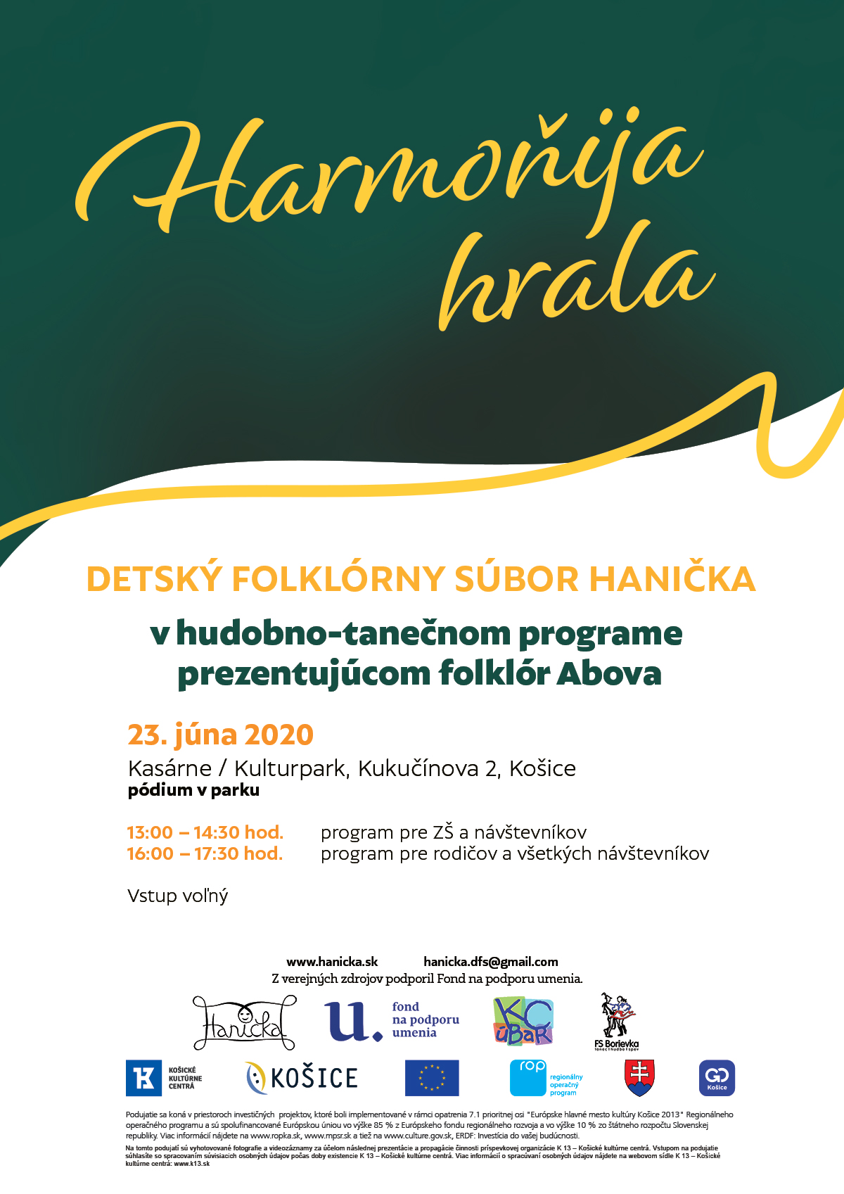 hudobno-tanečný program Detského folklórneho súboru Hanička, ktorý prezentuje folklór Abova. 23.júna 2020 Kasárne/Kulturpark, Kukučínova 2, Košice vonkajšie pódium