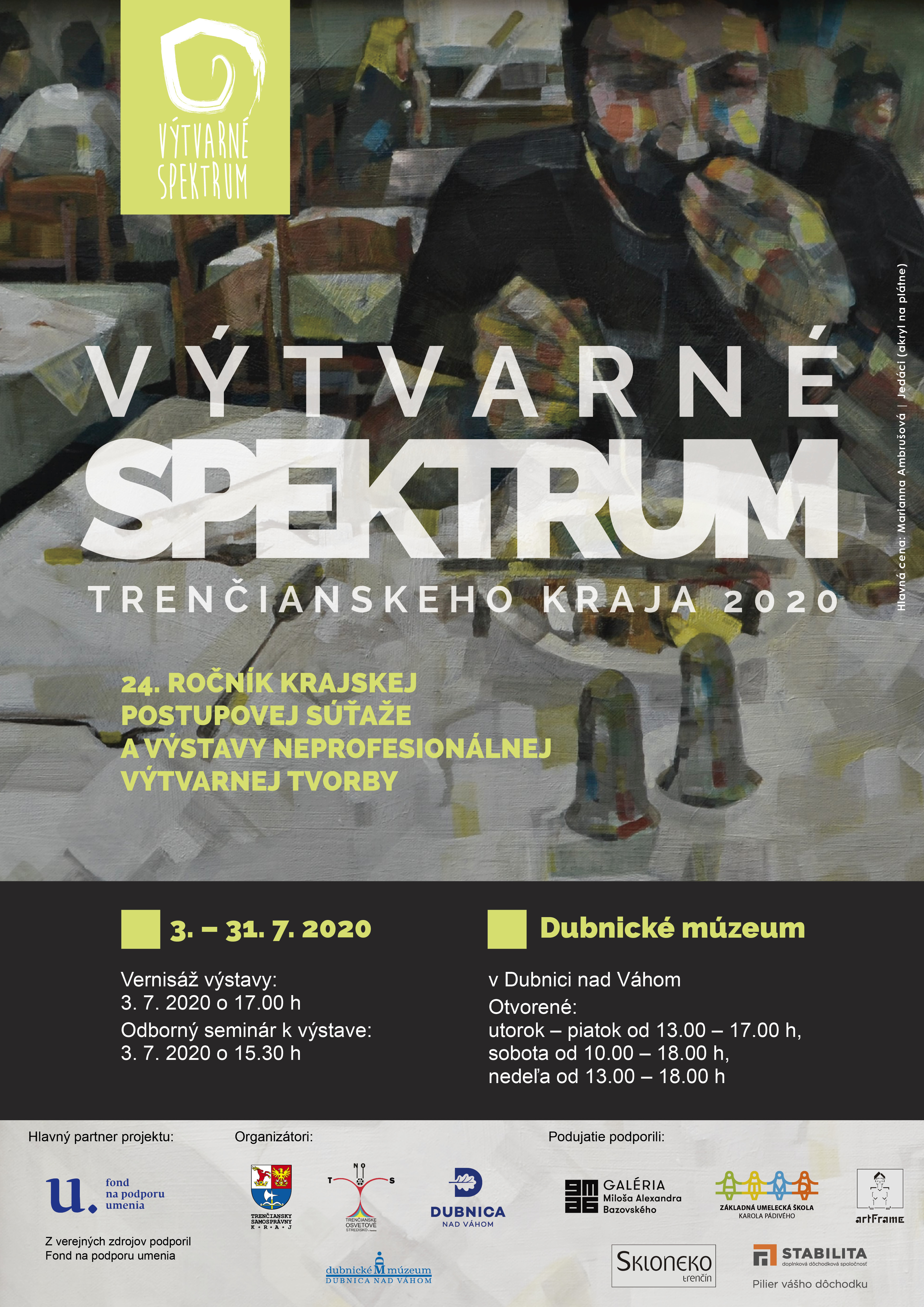 Srdečne vás pozývame na výstavu z 24. ročníka krajskej postupovej súťaže neprofesionálnej výtvarnej tvorby VÝTVARNÉ SPEKTRUM Trenčianskeho kraja 2020. Vernisáž výstavy spojená s odovzdávaním ocenení sa uskutoční 3. júla 2020 o 17.00 h v Dubnickom múzeu v Dubnici nad Váhom. Odborný seminár k výstave: 3. júla 2020 o 15.30 h, Dubnické múzeum.
