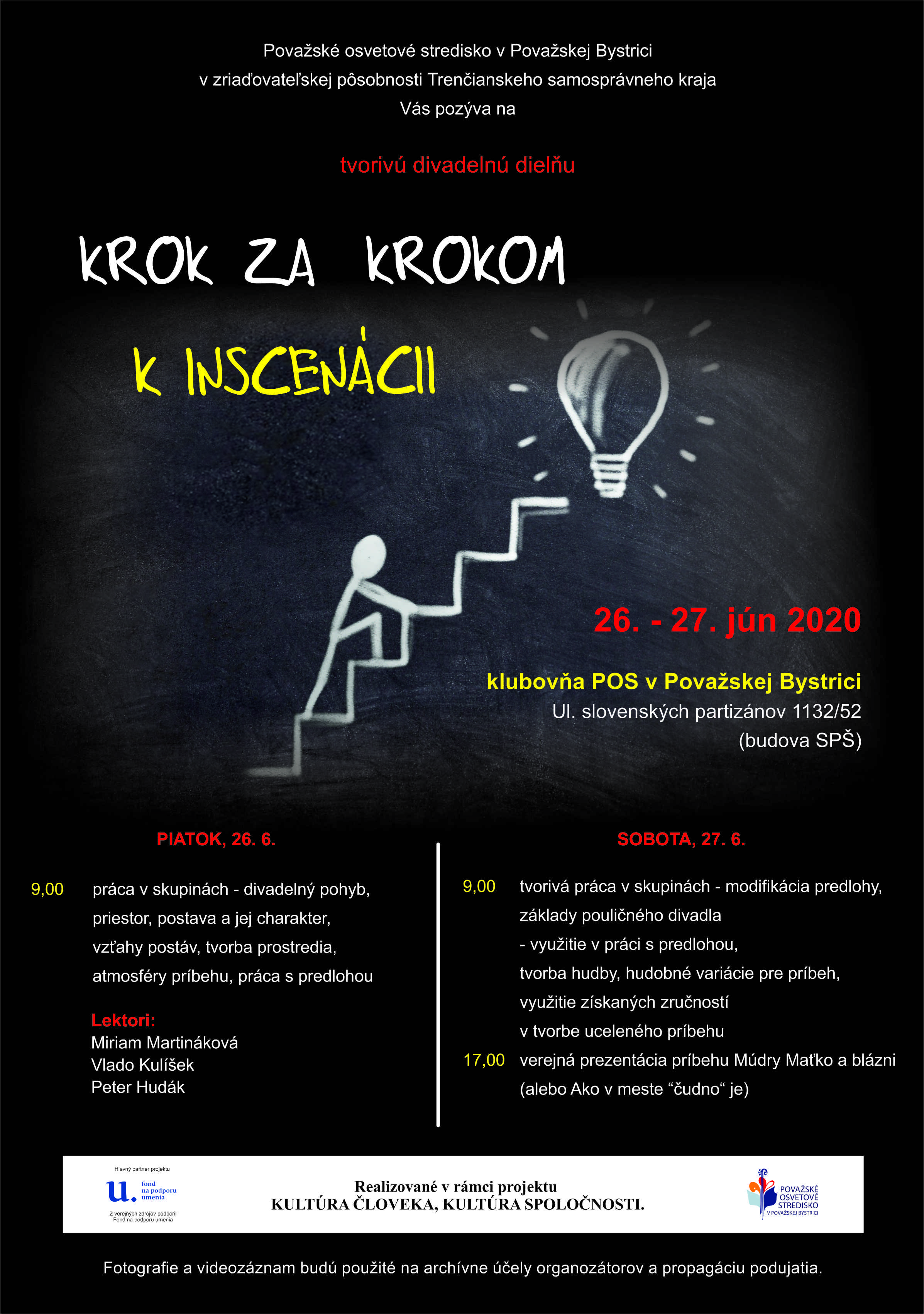 Považské osvetové stredisko v Považskej Bystrici pozýva členov neprofesionálnych divadelných súborov na tvorivú divadelnú dielňu KROK ZA KROKOM K INSCENÁCII. Podujatie sa uskutoční dňa 26. a 27. júna 2020 v priestoroch Považského osvetového strediska v Považskej Bystrici (budova SPŠ).
