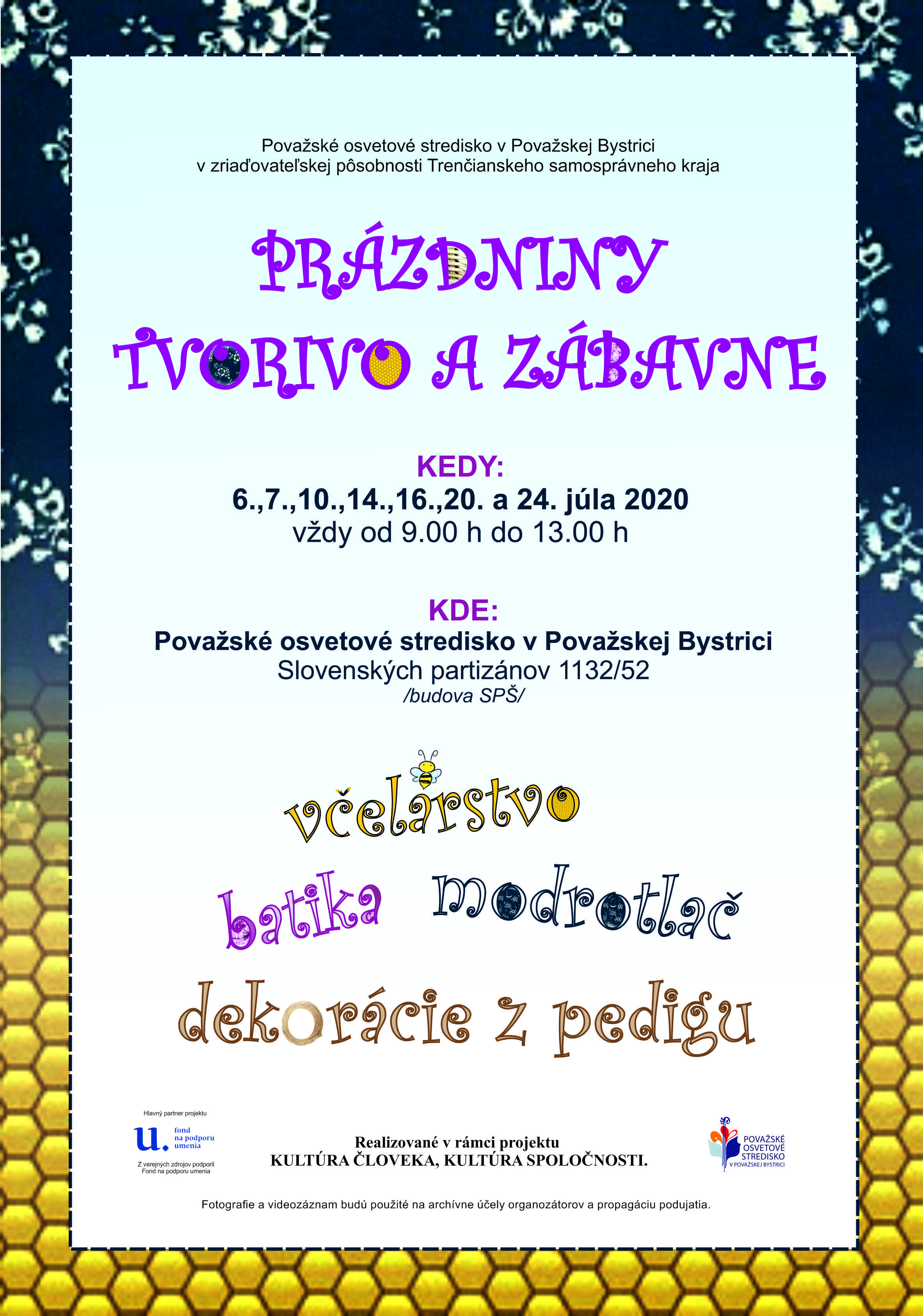 Považské osvetové stredisko v Považskej Bystrici pripravilo pre deti prázdninové tvorivo- zábavné dielne. Počas troch týždňov (6.-24. júla) sa budeme venovať textilným technikám (modrotlač, batika), košikárstvu (pletenie a výroba dekorácií z pedigu), odhalíme tajuplný a zaujímavý život včiel a včelárstva.