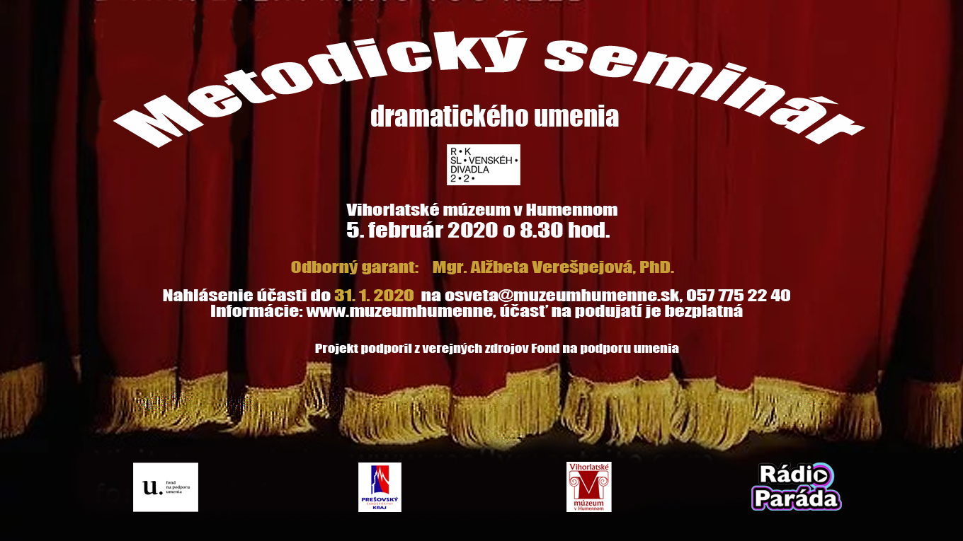 Zámerom tejto aktivity je podpora divadla v regióne. Mladým divadelníkom, recitátorom a tentokrát hlavne pedagógom pomôžeme hravou formou získavať vedomosti a osvojovať si zručnosti v tejto oblasti a zároveň im pomôžeme s prípravou pred regionálnou súťažou divadelných súborov a scénických miniatúr (pre okresy Humenné, Snina a Medzilaborce) Divadelná jar 2020.
