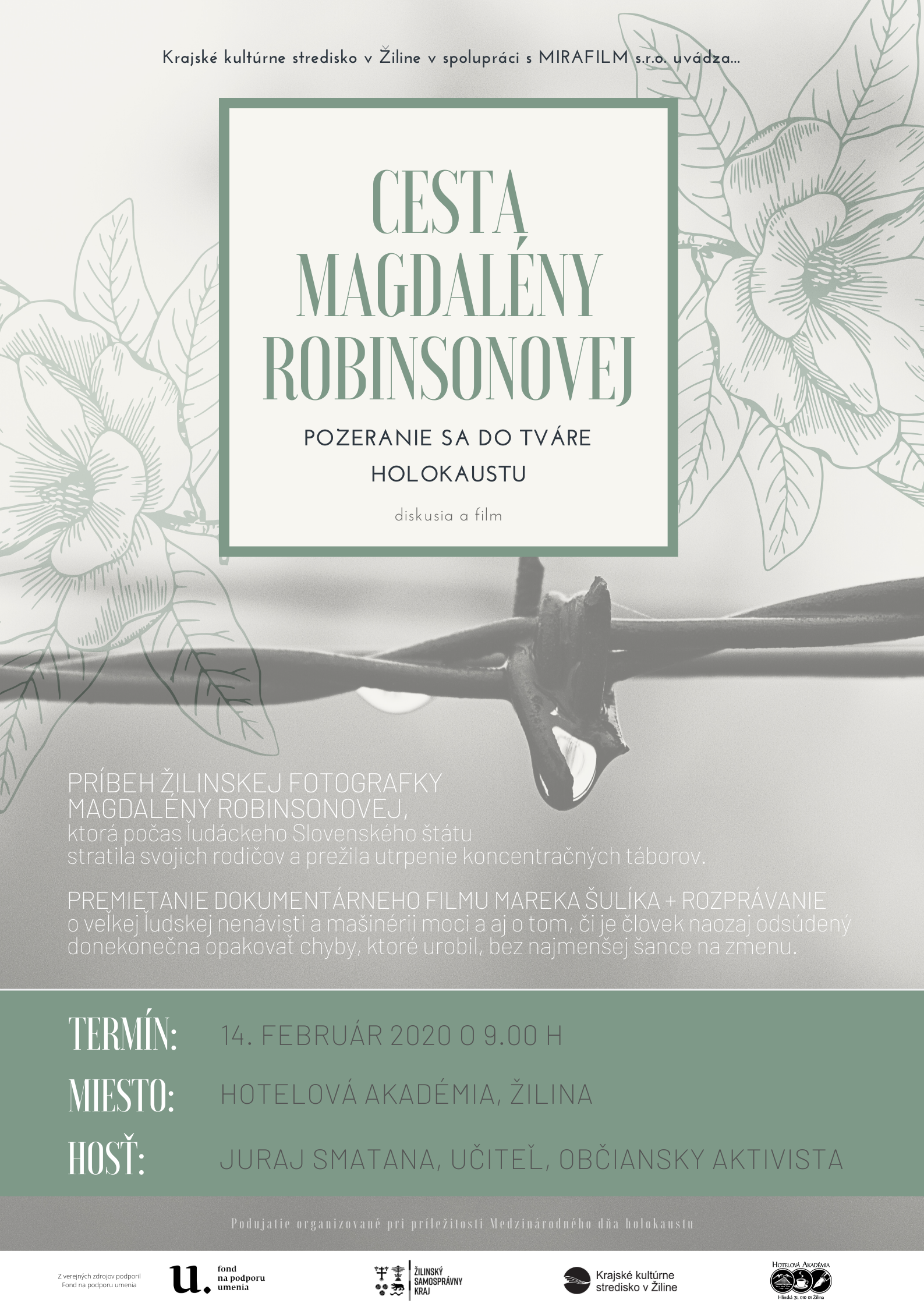 FILM S DISKUSIOU Príbeh žilinskej fotografky Magdalény Robinsonovej, ktorá počas ľudáckeho Slovenského štátu stratila svojich rodičov a prežila utrpenie koncentračných táborov. Premietanie dokumentárneho filmu Mareka Šulíka + rozprávanie o veľkej ľudskej nenávisti a mašinérii moci.