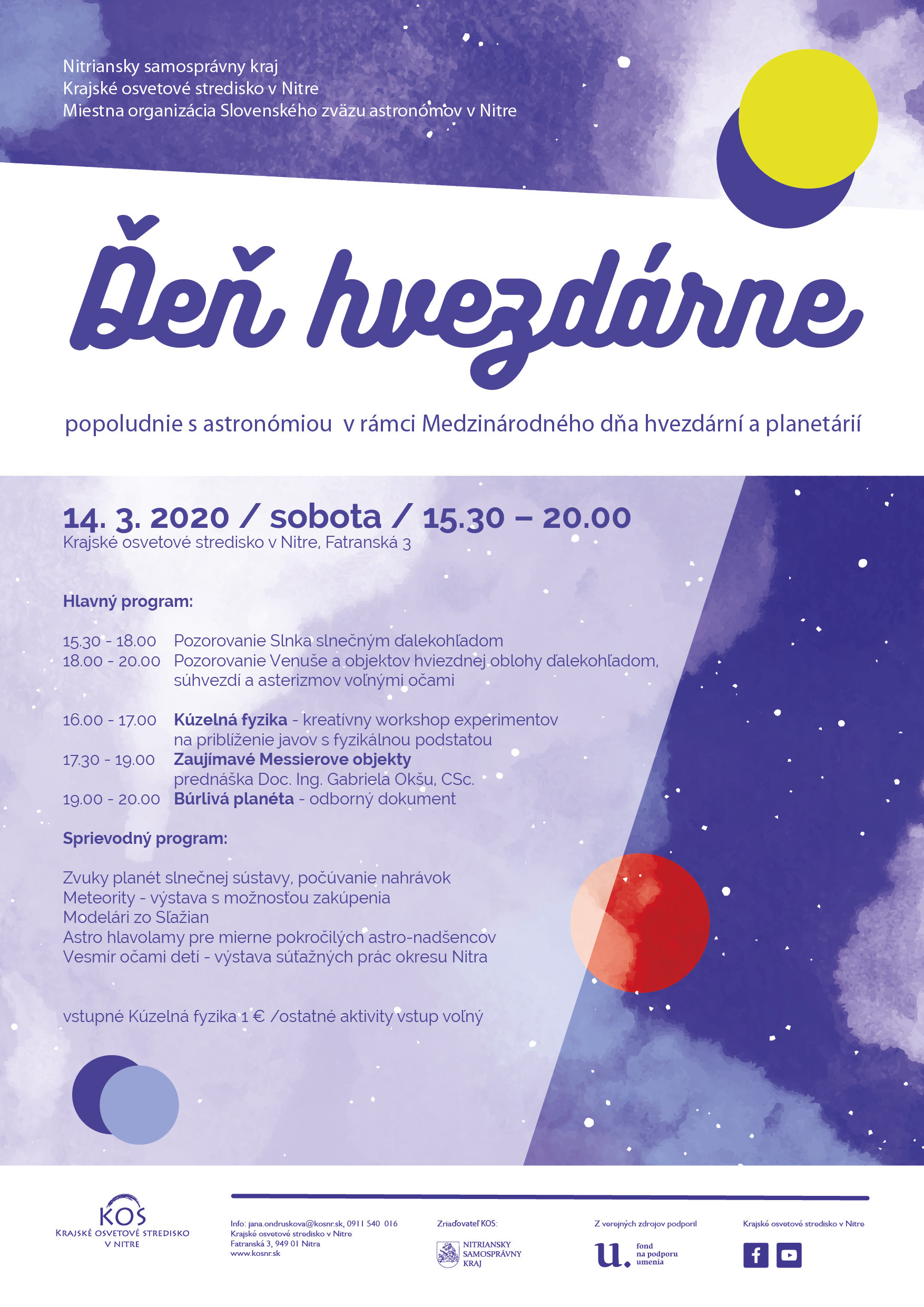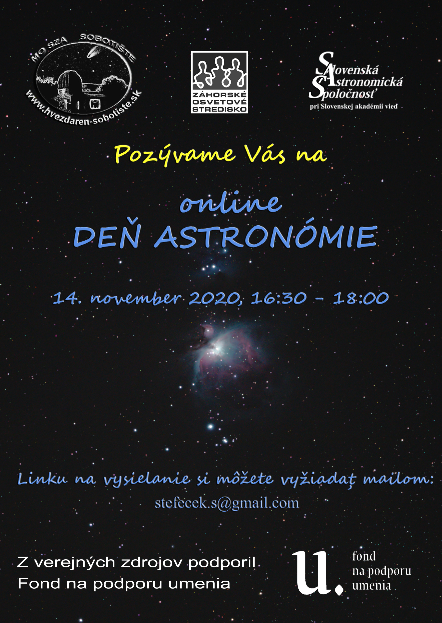 Deň astronómie - tradičné podujatie realizujúce sa v marci v priestoroch hvezdárne v Sobotišiti sme boli vzhľadom na nepriaznivú epidemiologickú situáciu presunúť do online priestoru v termíne 14.11. v čase 16:30 - 18:00.