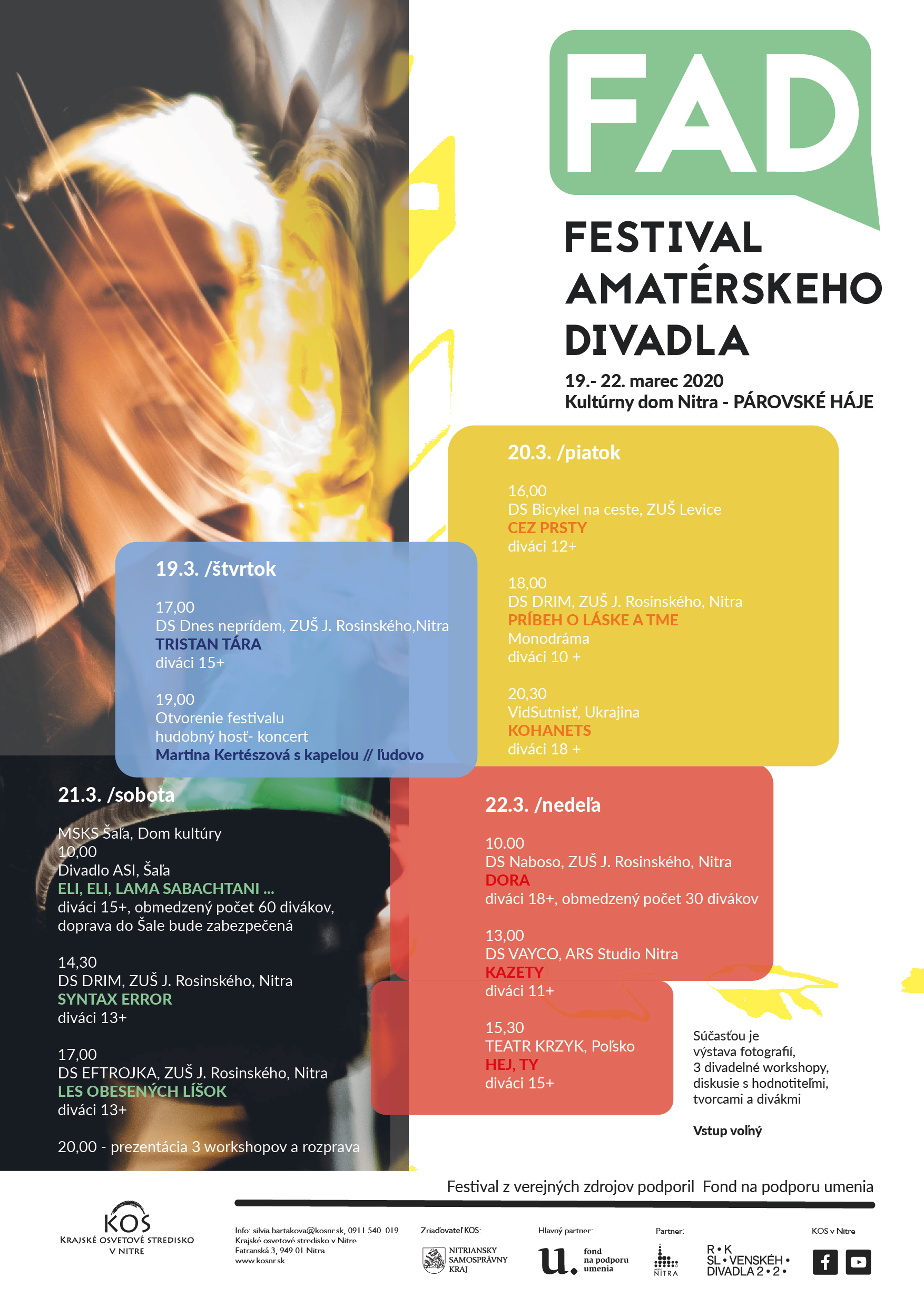 FAD 2020 - Festival Amatérskeho Divadla, rôznych poetík a žánrov. Je súčasťou Roku slovenského divadla. Ciele: 1.vytvoriť festivalový otvorený priestor pre neprofes.divadelné súbory, inšpiratívne, netradičné inscenácie, prvotiny,experimenty v dramatickom umení 2.viesť odbor.diskusiu o inscenáciách, dať priestor pre sebahodnotenie, konfrontáciu 3. rozvíjať zručnosti v oblasti divadla pre účastníkov, pomocou divadelných dielní pod vedením zah. lektorov (Ukrajina, Izrael, Poľsko)