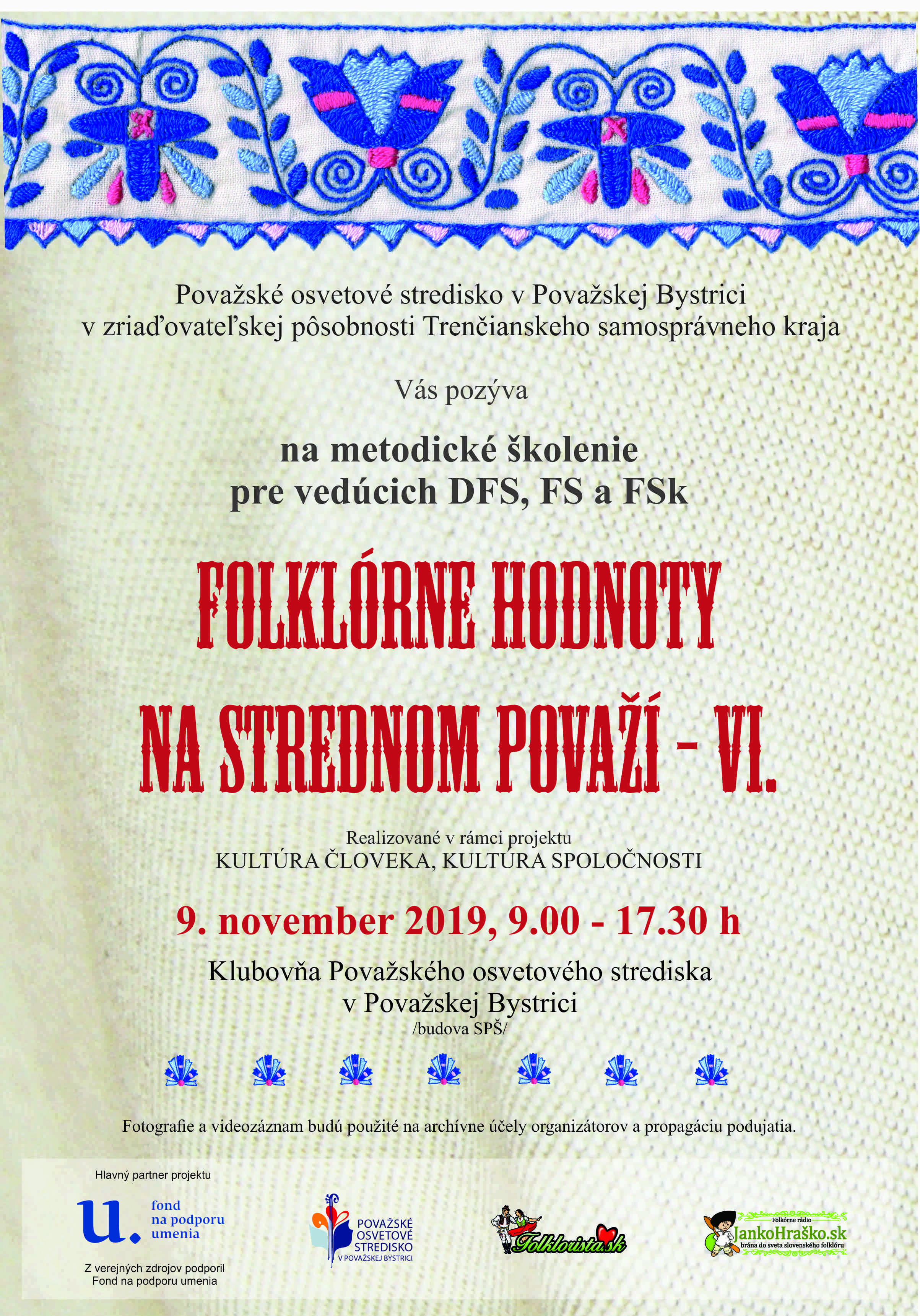 Považské osvetové stredisko v Považskej Bystrici Vás pozýva na metodické školenie Folklórne hodnoty na Strednom Považí VI pre vedúcich DFS, FS a FSk, ktoré sa uskutoční 9. novembra 2019 (sobota) v Považskom osvetovom stredisku v Považskej Bystrici.