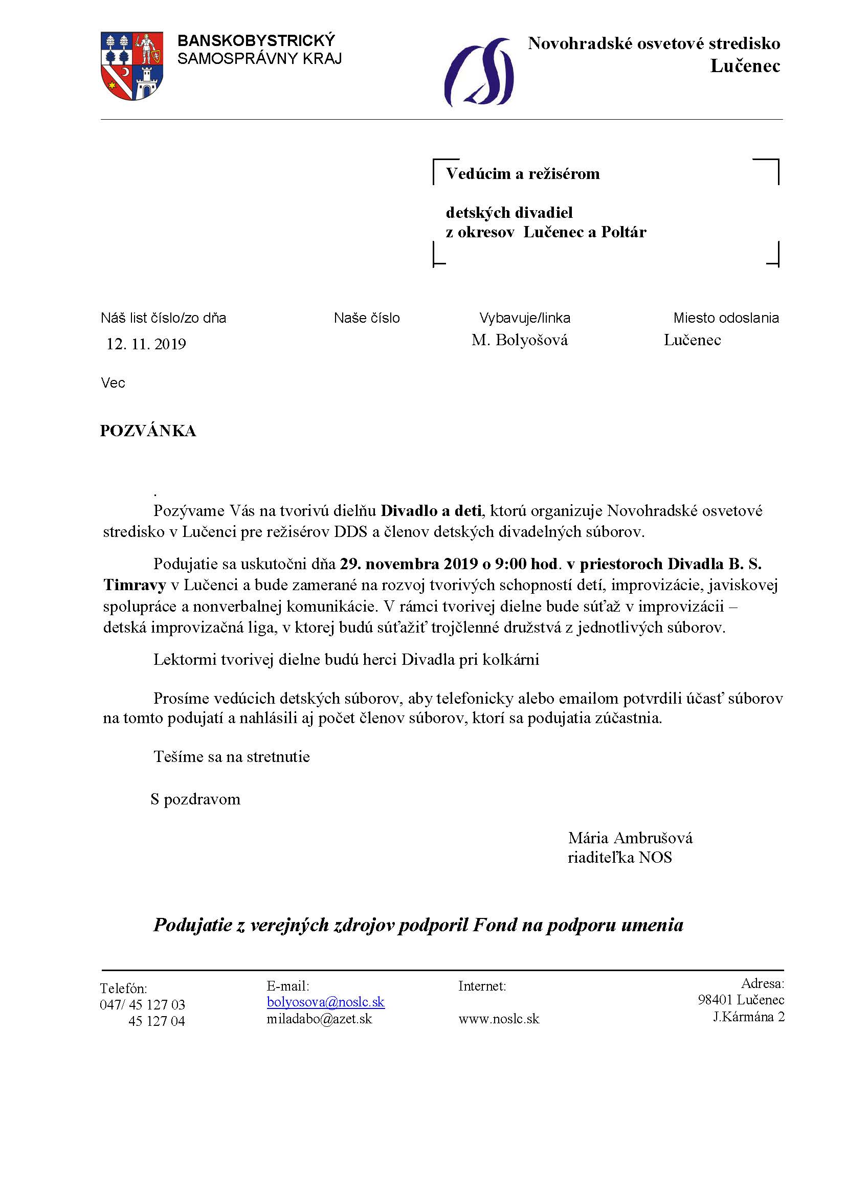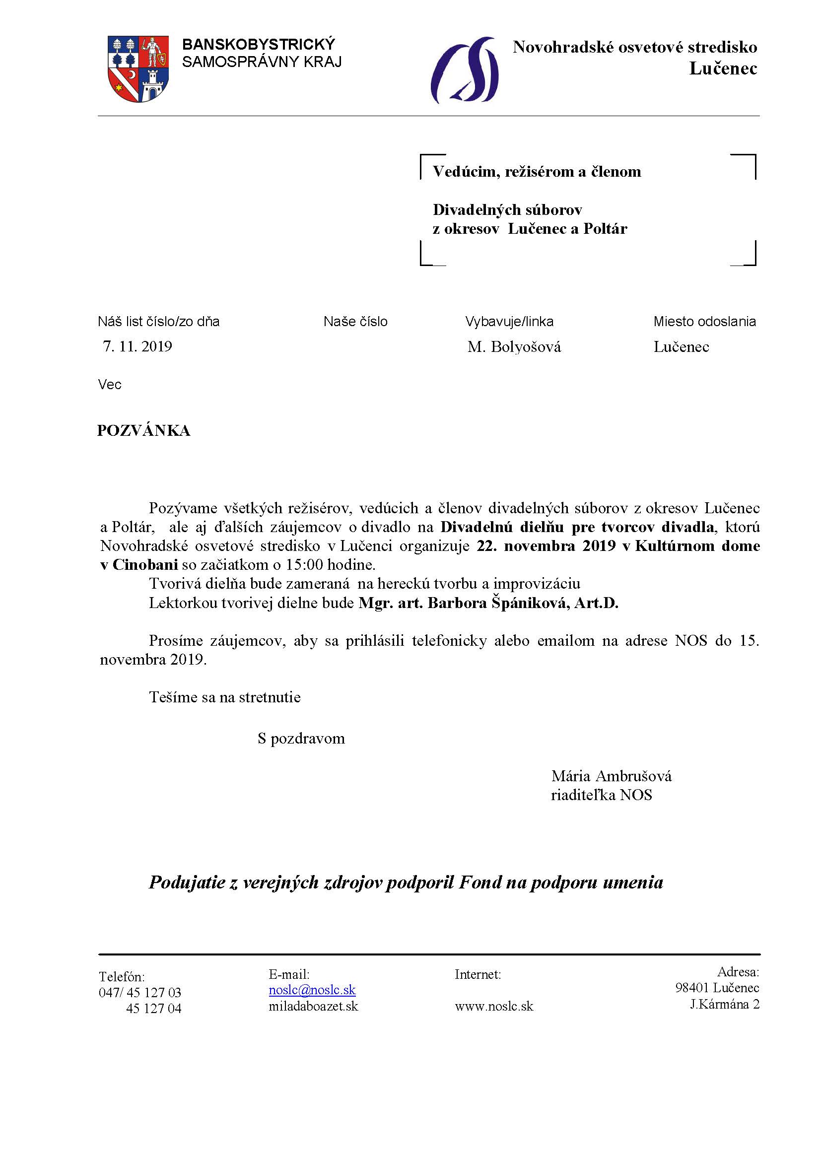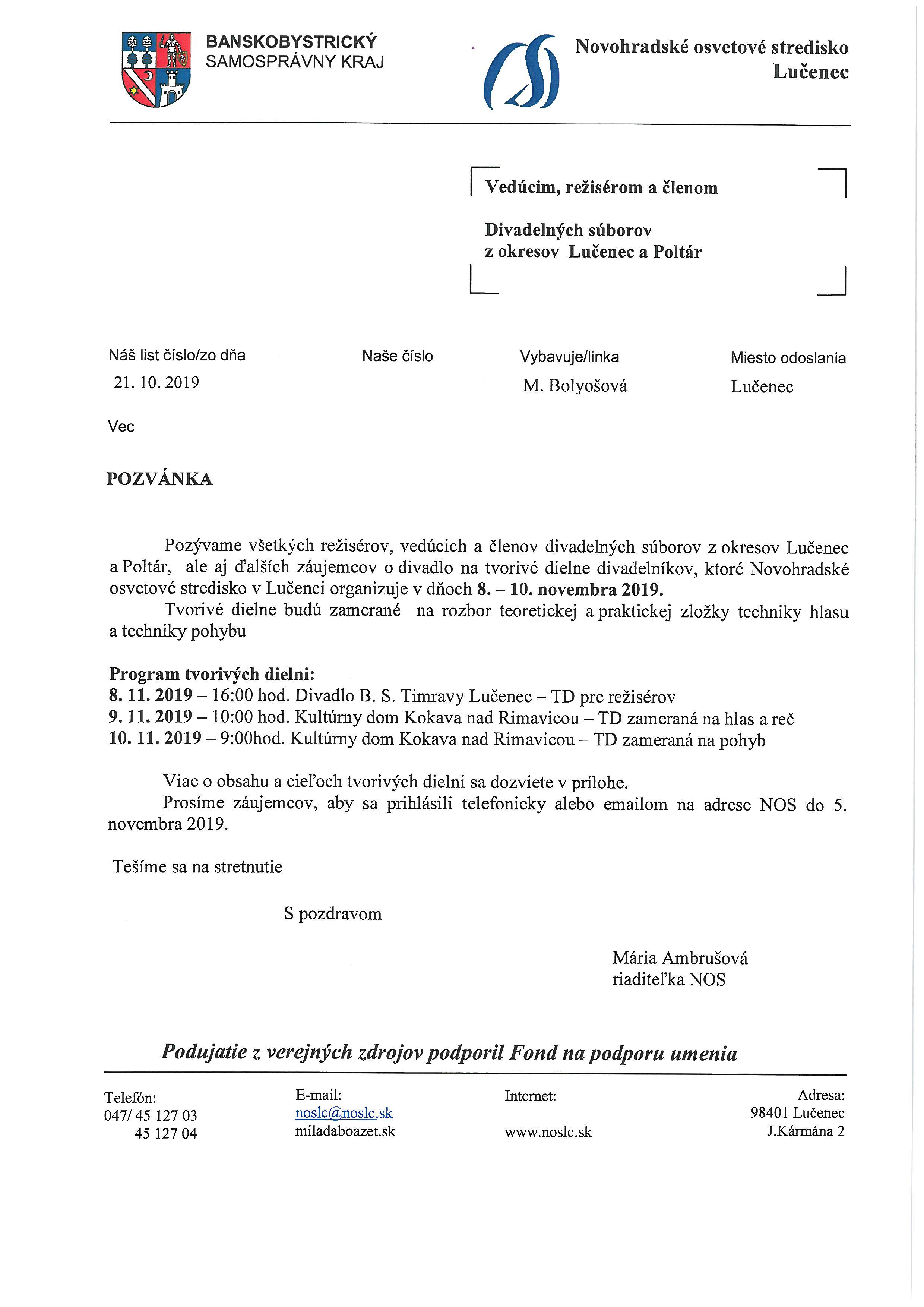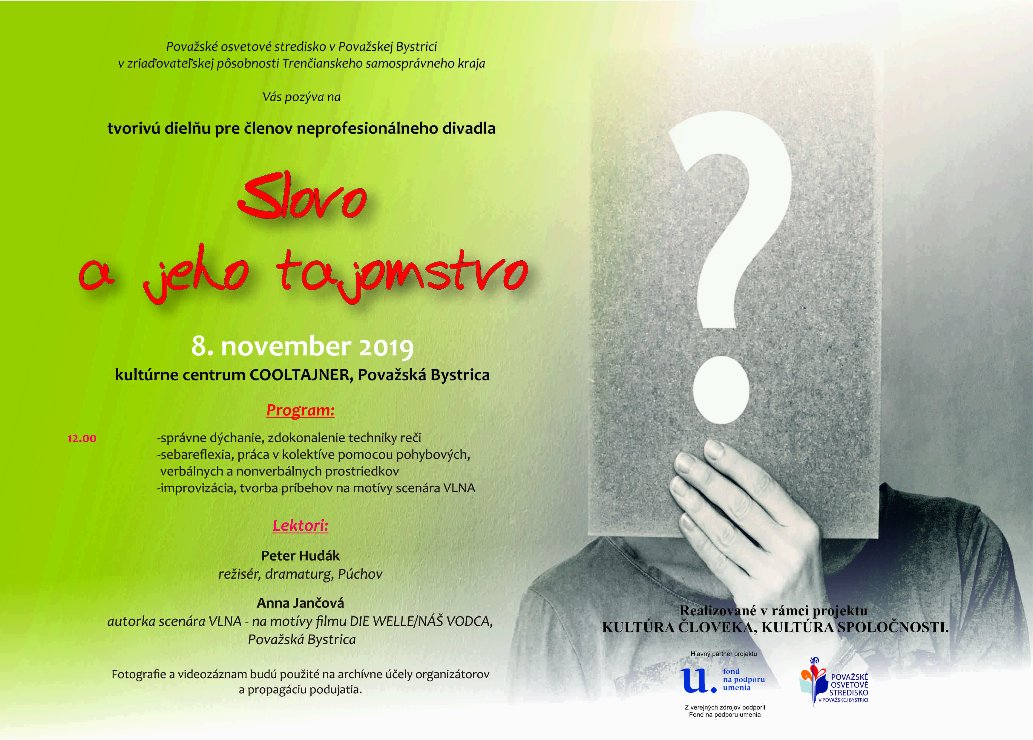 Považské osvetové stredisko v Považskej Bystrici pozýva členov neprofesionálneho divadla v okresoch Považská Bystrica, Púchov, Ilava na tvorivú divadelnú dielňu SLOVO A JEHO TAJOMSTVO II., ktorá sa uskutoční dňa 8.11.2011 v kultúrnom centre Cooltajner v Považskej &bystrici.
