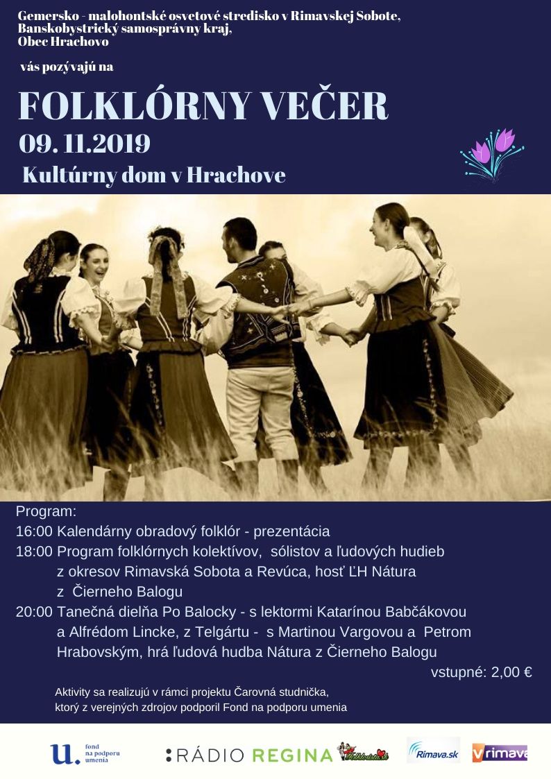 Gemersko - malohontské osvetové stredisko, Banskobystrický samosprávny kraj, v spolupráci s obcou Hrachovo, Vás pozývajú na Folklórny večer, 9. novembra 2019 od 16:00, do Kultúrneho domu v Hrachove. Vzdelávacie podujatie sa koná v rámci projektu Čarovná studnička, ktorý z verejných zdrojov podporil Fond na podporu umenia.