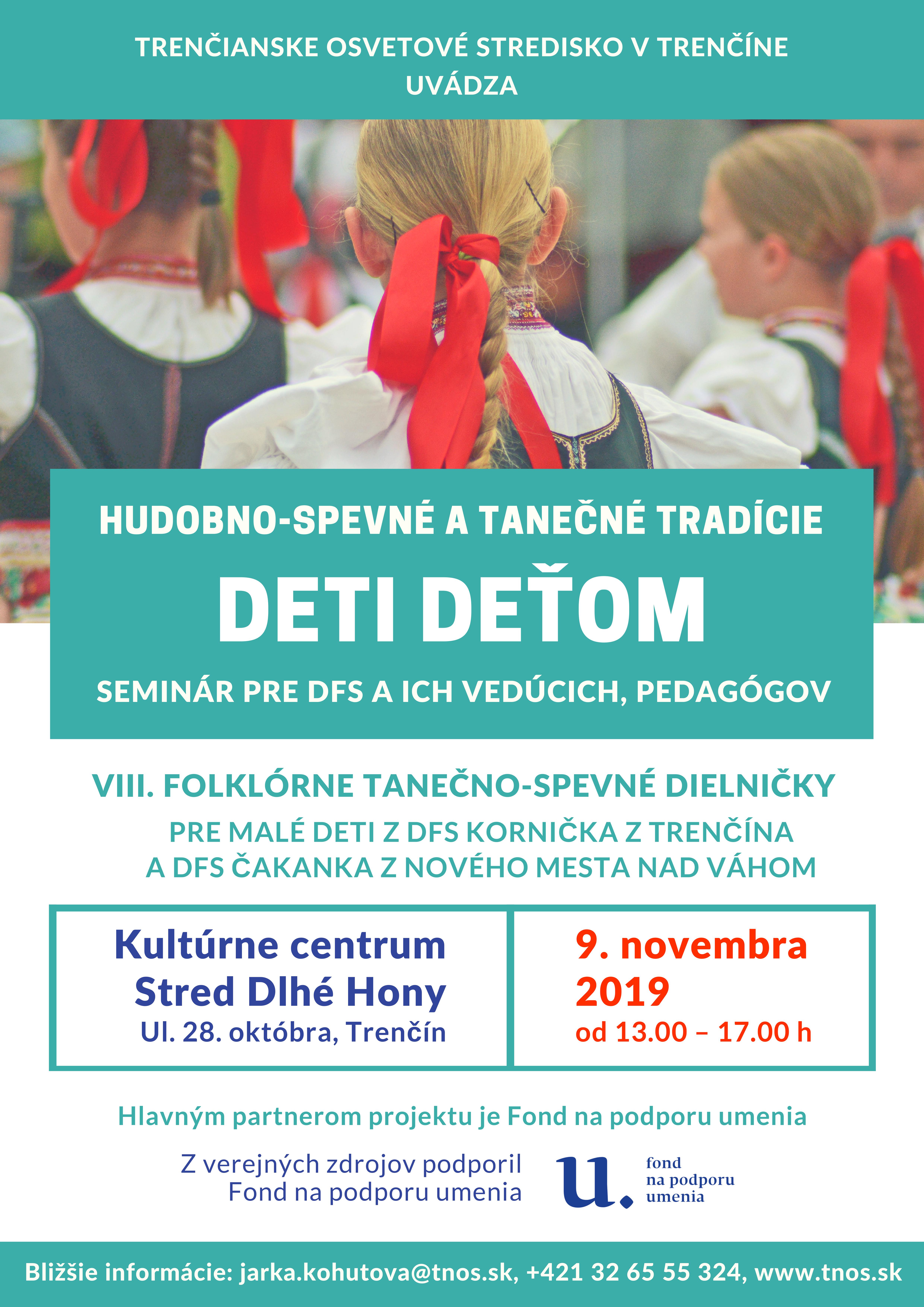 Trenčianske osvetové stredisko v Trenčíne v nadväznosti na vzdelávacie semináre z predchádzajúcich rokov pripravuje HUDOBNO-SPEVNÉ A TANEČNÉ TRADÍCIE – DETI DEŤOM, seminár pre detské folklórne súbory a ich vedúcich, pedagógov – VIII. folklórne tanečno-spevné a hudobné dielničky pre malé deti z DFS Kornička Trenčín a DFS Čakanka Nové Mesto nad Váhom.