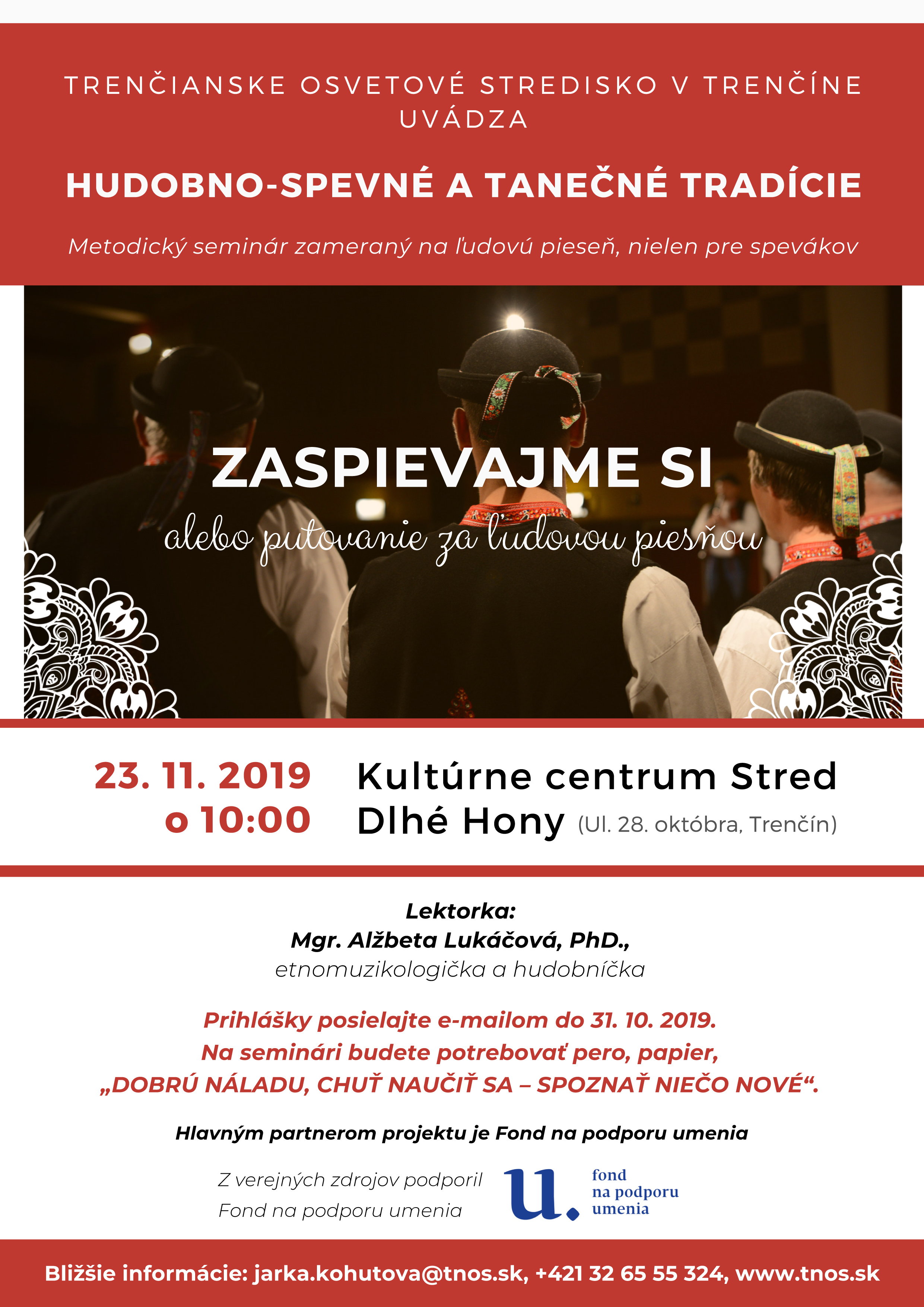 Trenčianske osvetové stredisko v Trenčíne pripravuje HUDOBNO-SPEVNÉ A TANEČNÉ TRADÍCIE – ZASPIEVAJME SI alebo putovanie za ľudovou piesňou, metodický seminár zameraný na ľudovú pieseň, nielen pre spevákov s lektorkou Mgr. Alžbetou Lukáčovou, PhD., etnomuzikologičkou a hudobníčkou.