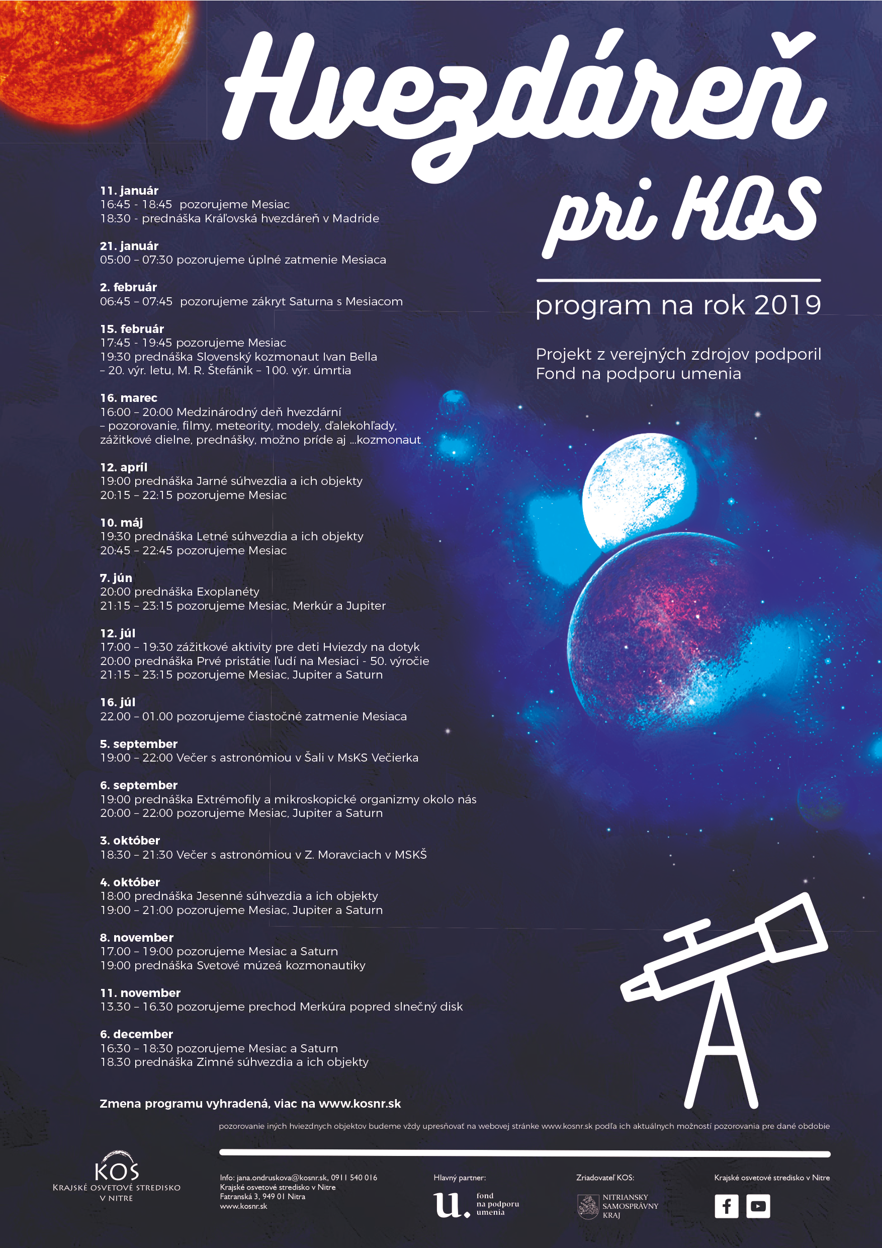 Večerné pozorovanie objektov na oblohe a prednáška o svetových múzeách kozmonautiky pre neorganizovanú verejnosť.