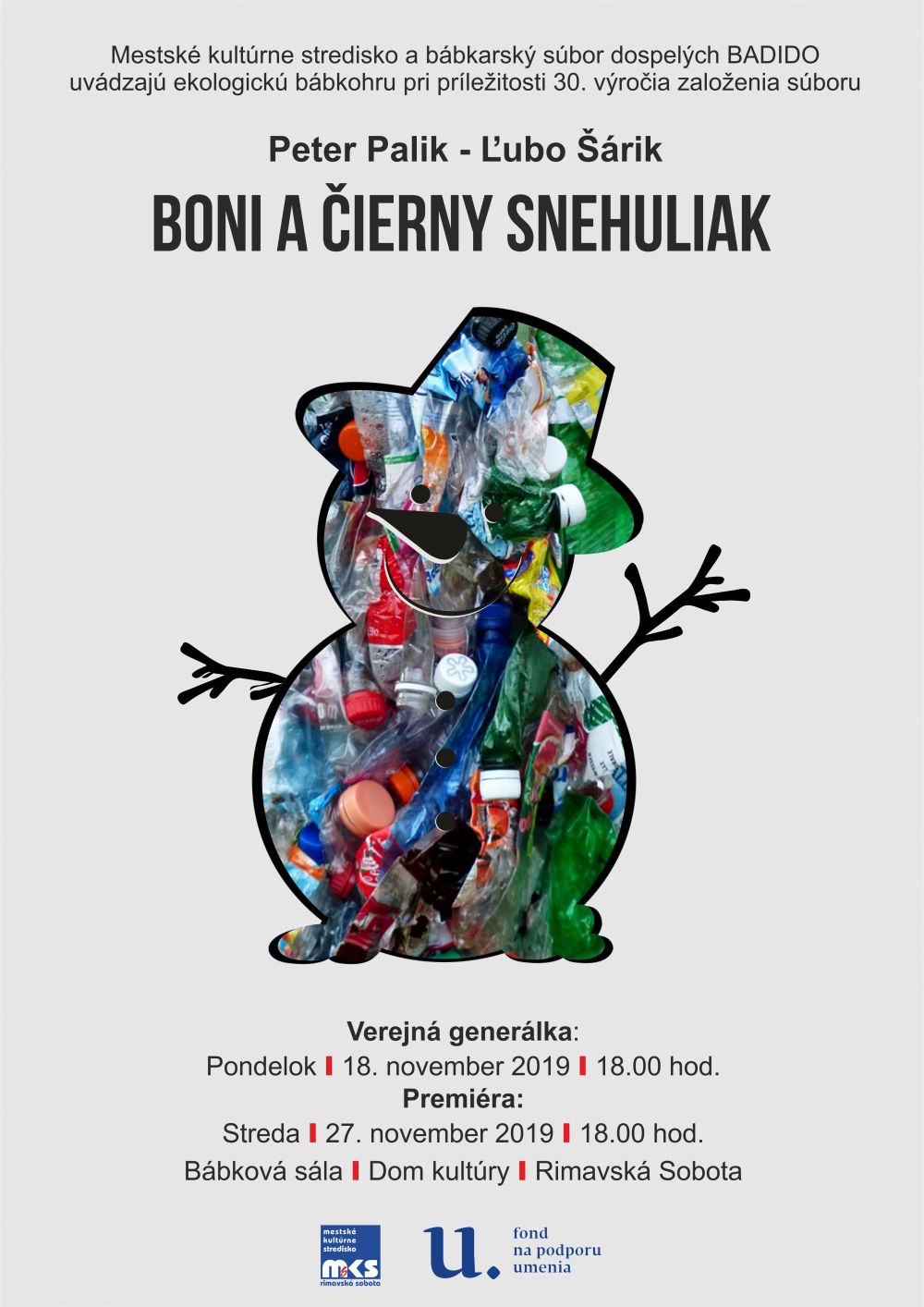 MsKS a BS BADIDO uvádzajú ekologickú bábkohru pri príležitosti 30. výročia založenia súboru. Inscenáciu pre deti Boni a čierny snehuliak podľa rozprávok J. Uličianskeho Snehuliacke ostrovy pre bábkové divadlo upravil Peter Palik a pre potreby BS Badido prepísal Ľ. Šárik. Verejná generálka bude 18. 11. o 18.00 hod. v DK Rimavská Sobota. Premiéra je naplánovaná na 27. 11. o 18.00 hod. V predstavení si zahrajú rimavskosobotskí ochotníci: T. Maksi, R. Čarnoký, N. Garayová, M. Kopec a H. Chrenková.