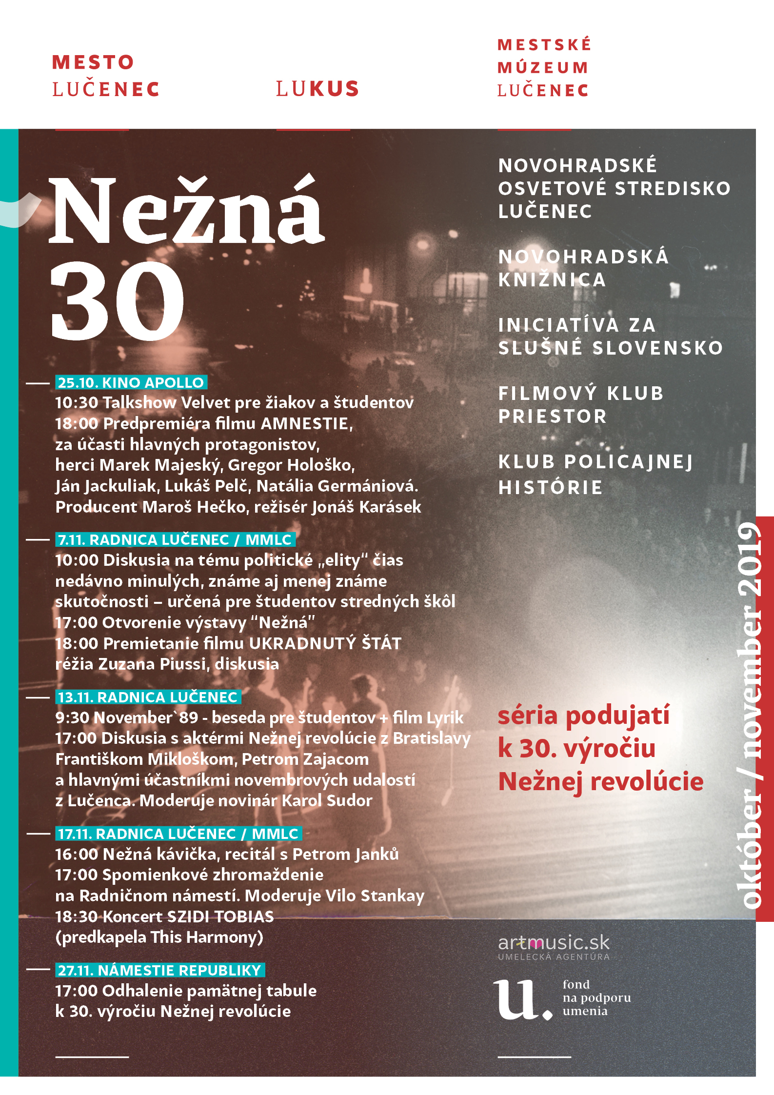 Mestské múzeum Lučenec výstavou NEŽNÁ sleduje zámer o priblíženie novembrových udalostí prevažne mladej generácii. Plánuje vyzvať pamätníkov týchto dní o spoluprácu formou prinesenia a zapožičania fotografií, transparentov a iných artefaktov dokladujúcich novembrové udalostí roku 1989. Kurátor výstavy sa pokúsi o to, aby obyvateľmi Lučenca prinesené artefakty mohli zostať v múzeu (zbierkové predmety), ako doklad revolúcie spred 30. rokov.